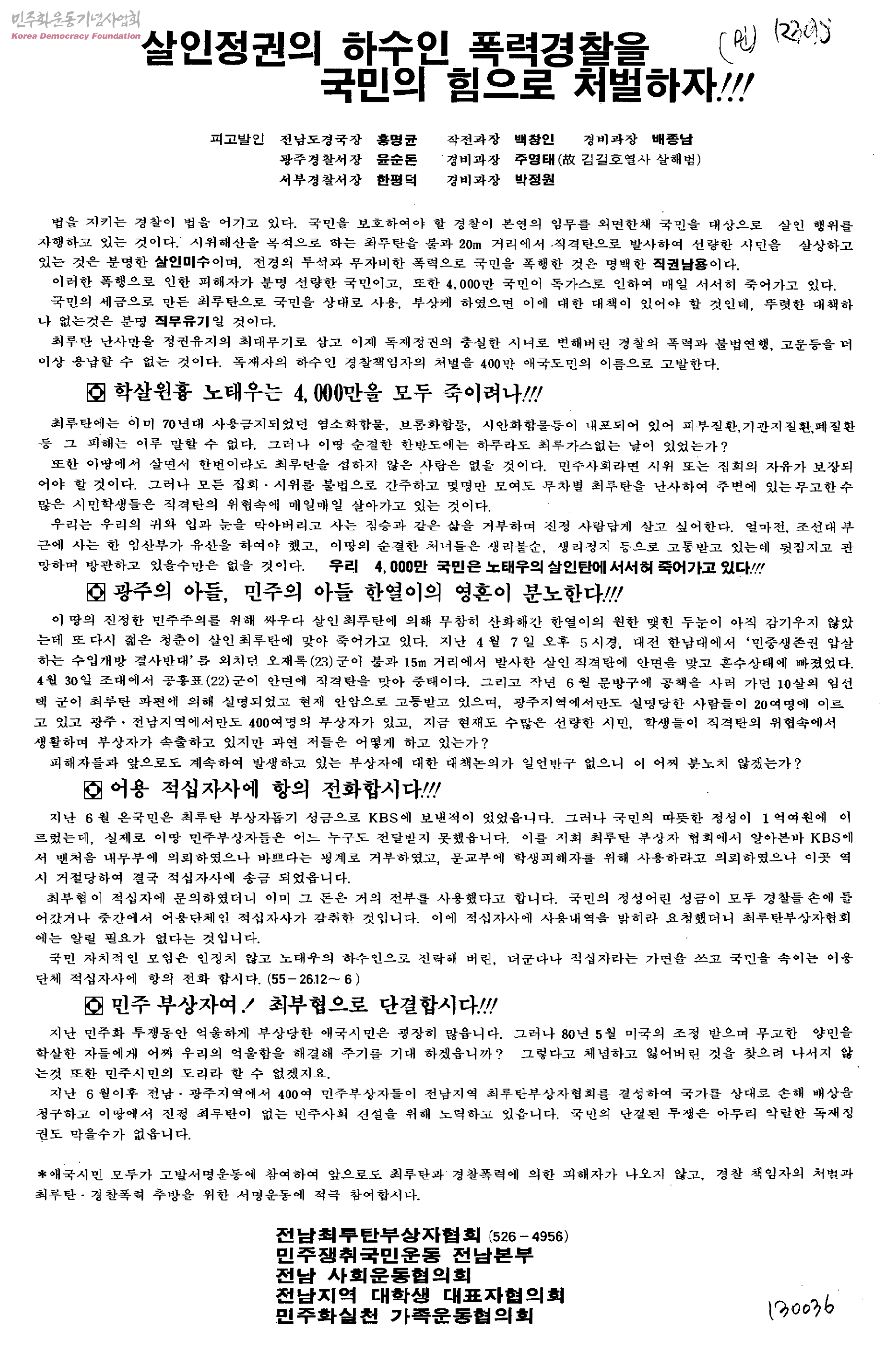- 전남최루탄부상자협회, 민주쟁취국민운동전남본부, 전남사회운동협의회, 전남지역대학생대표자협의회, 민주화실천가족운동협의회