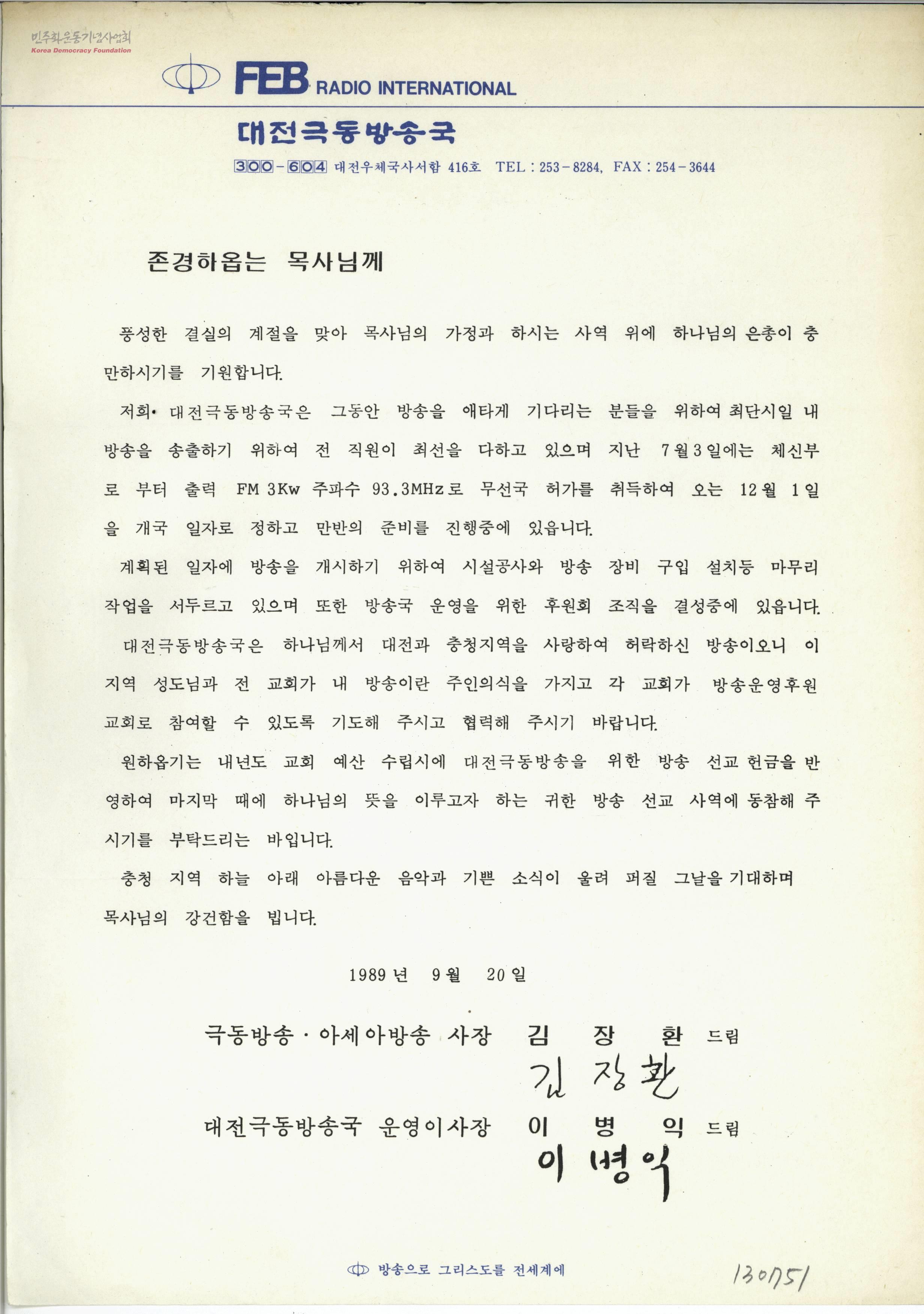 극동방송·아세아방송 사장 김장환과 대전극동방송국 운영이사장 이병익이 목사님께 드리는 글]