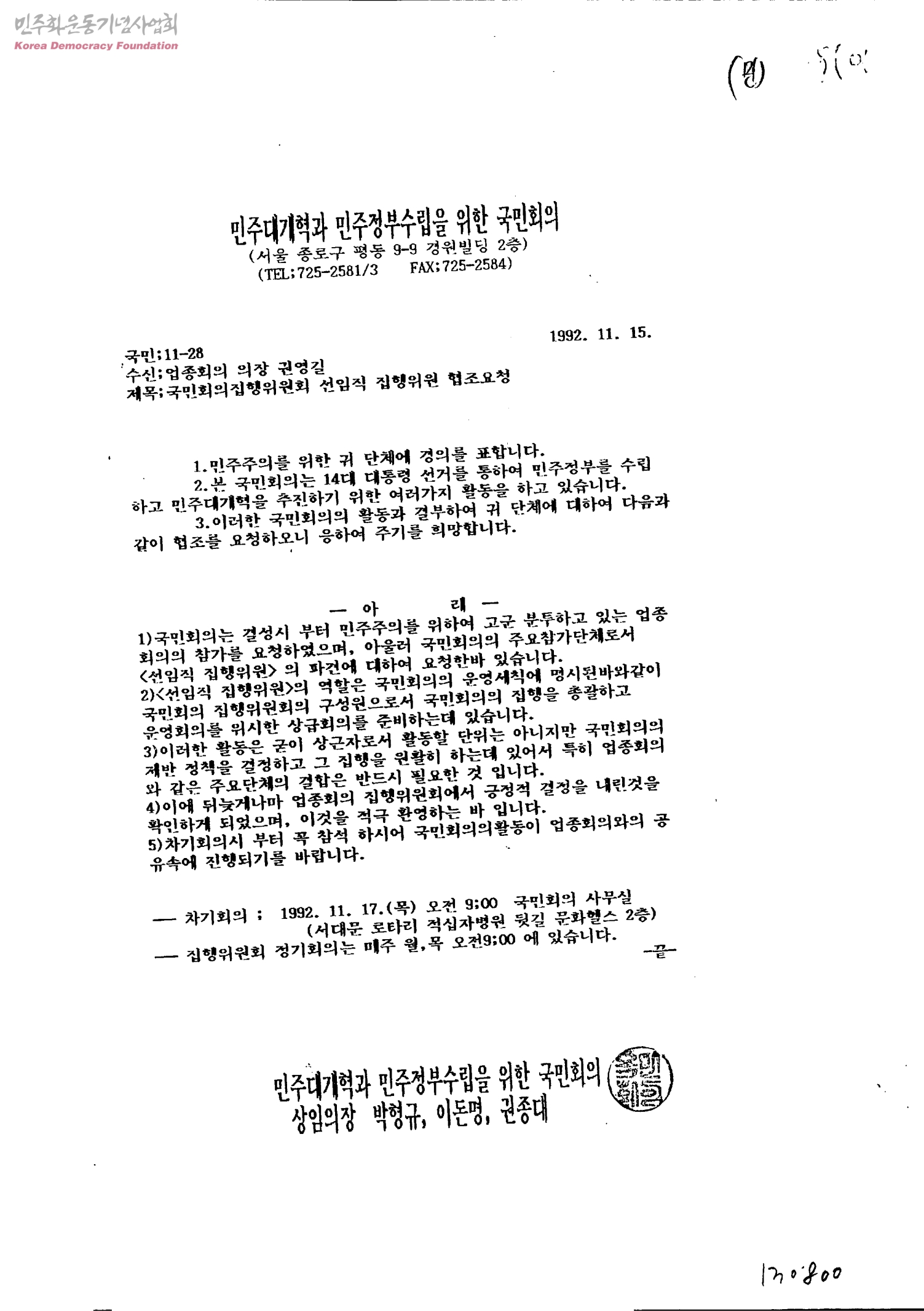 국민회의 집행위원회 선임직 집행위원 협조요청[수신:업종회의 의장 권영길, 발신:민주대개혁과 민주정부수립을 위한 국민회의 상임의장 박형규, 이돈명, 권종대]