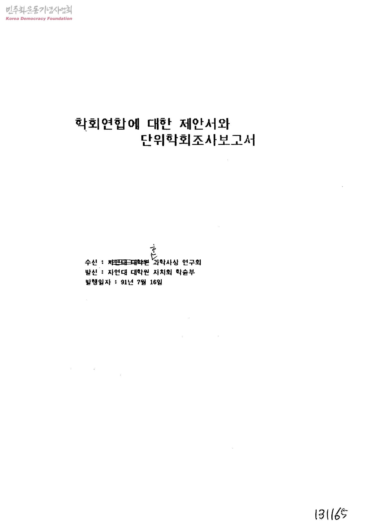 학회연합에 대한 제안서와 단위학회조사보고서[수신:ꏧ 과학사상 연구회, 발신:자연대 대학원 자치회 학술부]