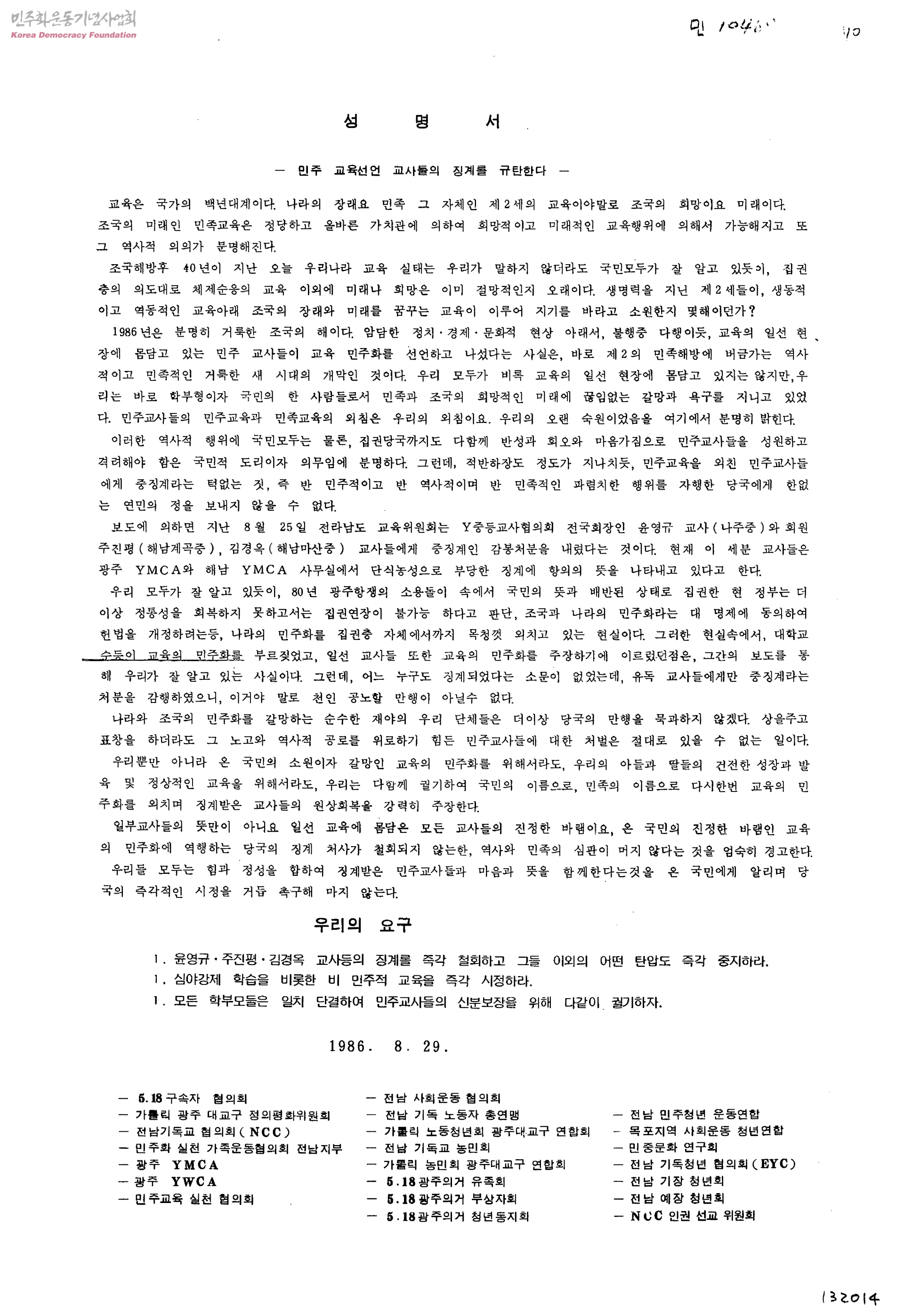 성명서-민주 교육선언 교사들의 징계를 규탄한다