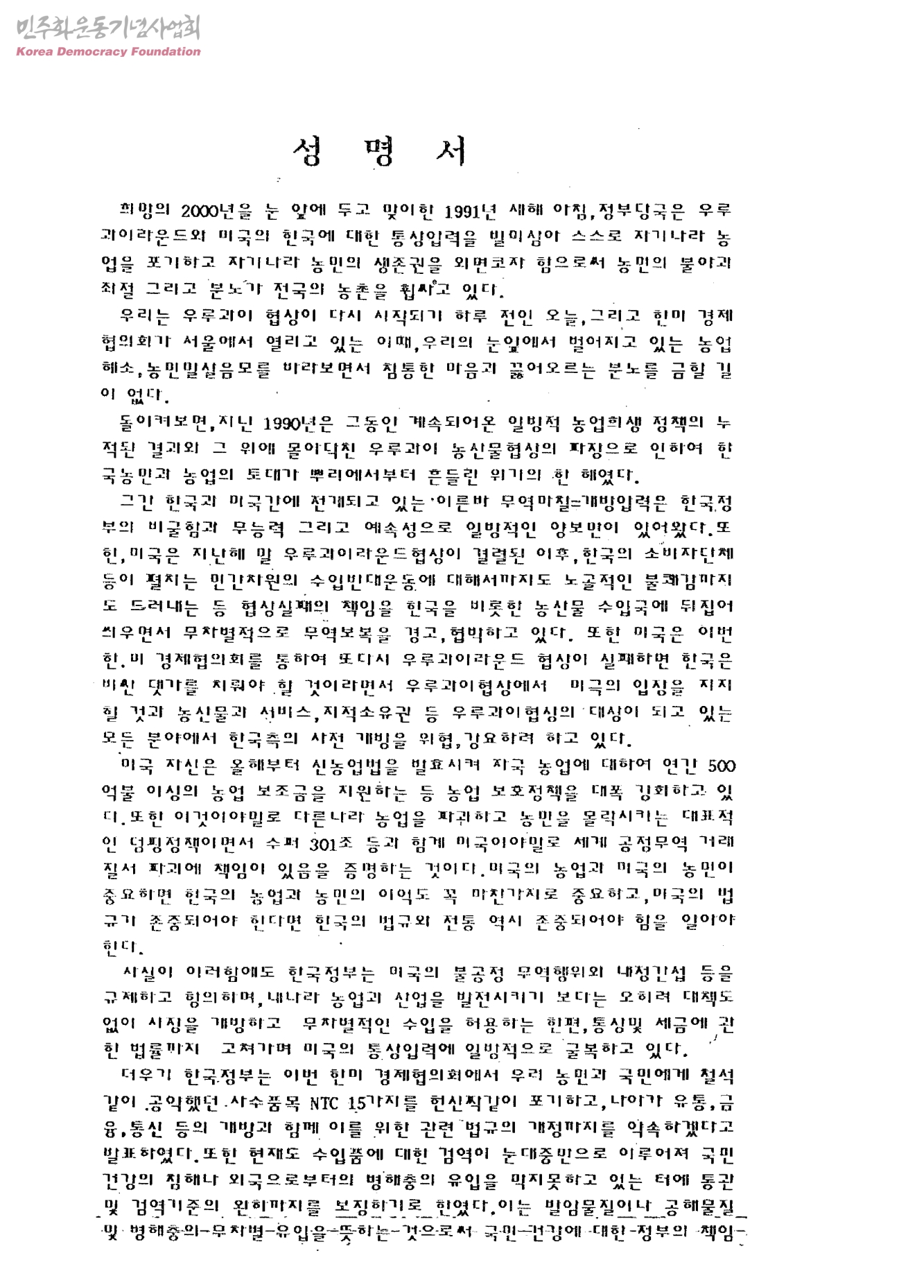 성명서[우루과이 협정 반대 및 미국의 시장개방압력 반대]