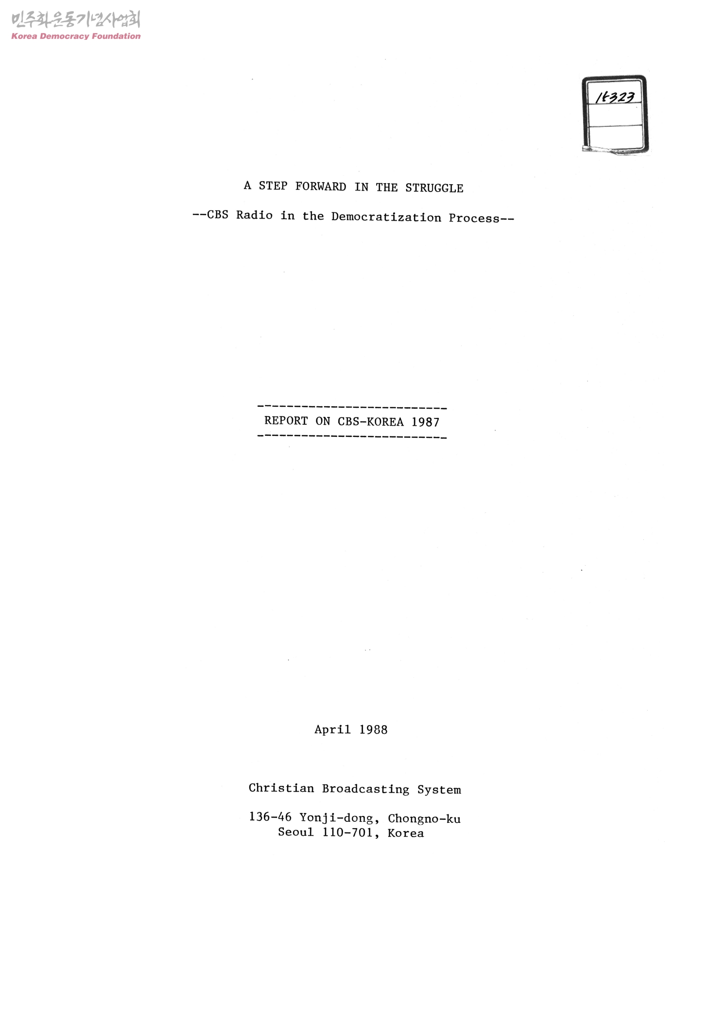 A STEP FORWARD IN THE STRUGGLE --CBS Radio in the Democratization Process REPORT ON CBS-KOREA 1987
