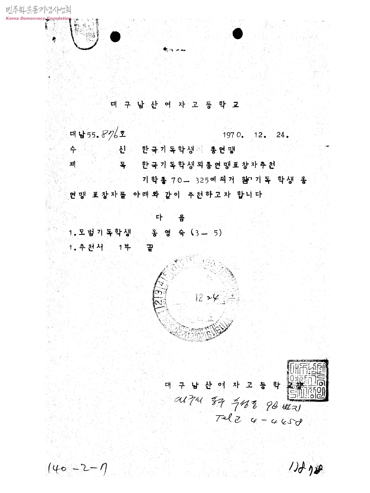 한국기독학생회총연맹표창자추천[수신:한국기독학생 총연맹]