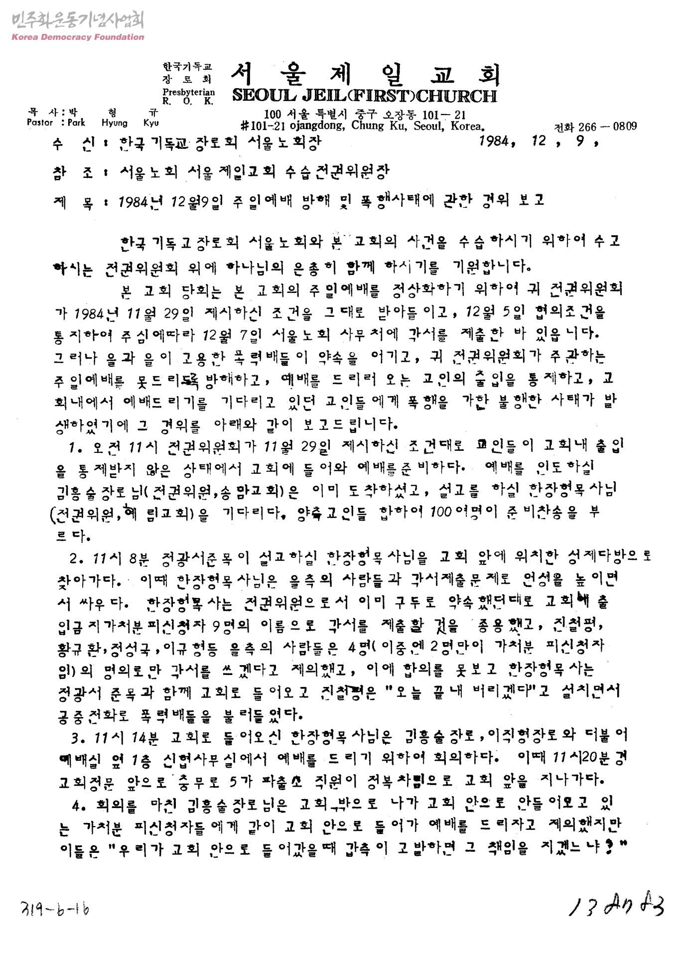 1984년 12월9일 주일예배 방해 및 폭행사태에 관한 경위 보고[수신:한국 기독교 장로회 서울 노회장]