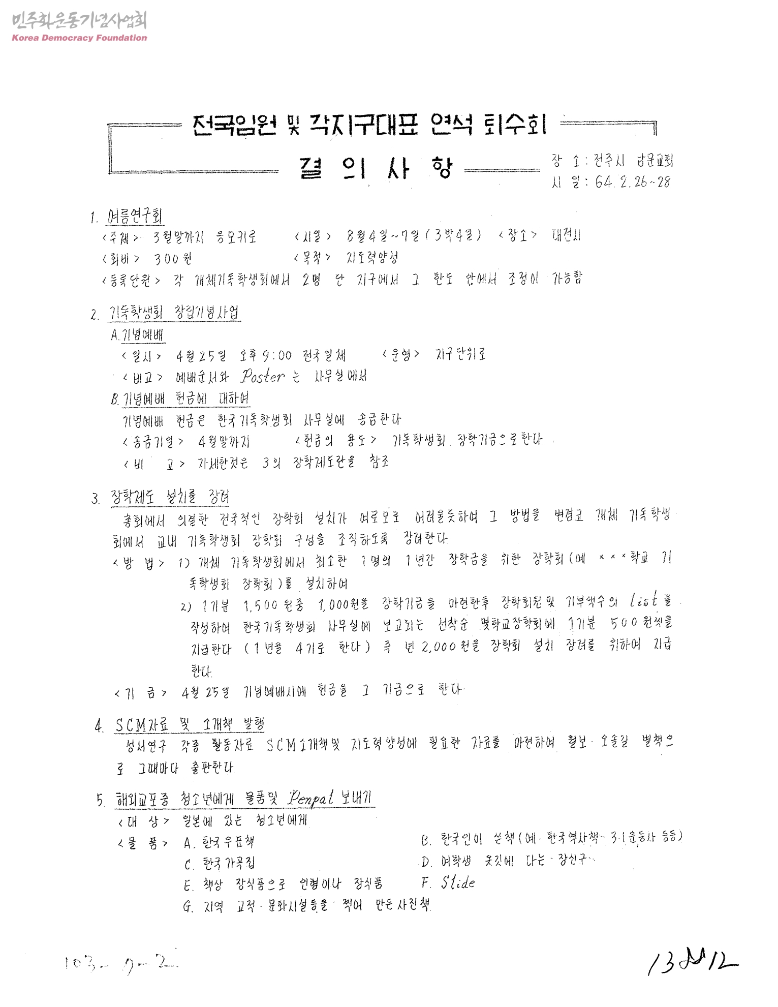 전국임원 및 각지구대표 연석 퇴수회 결의사항