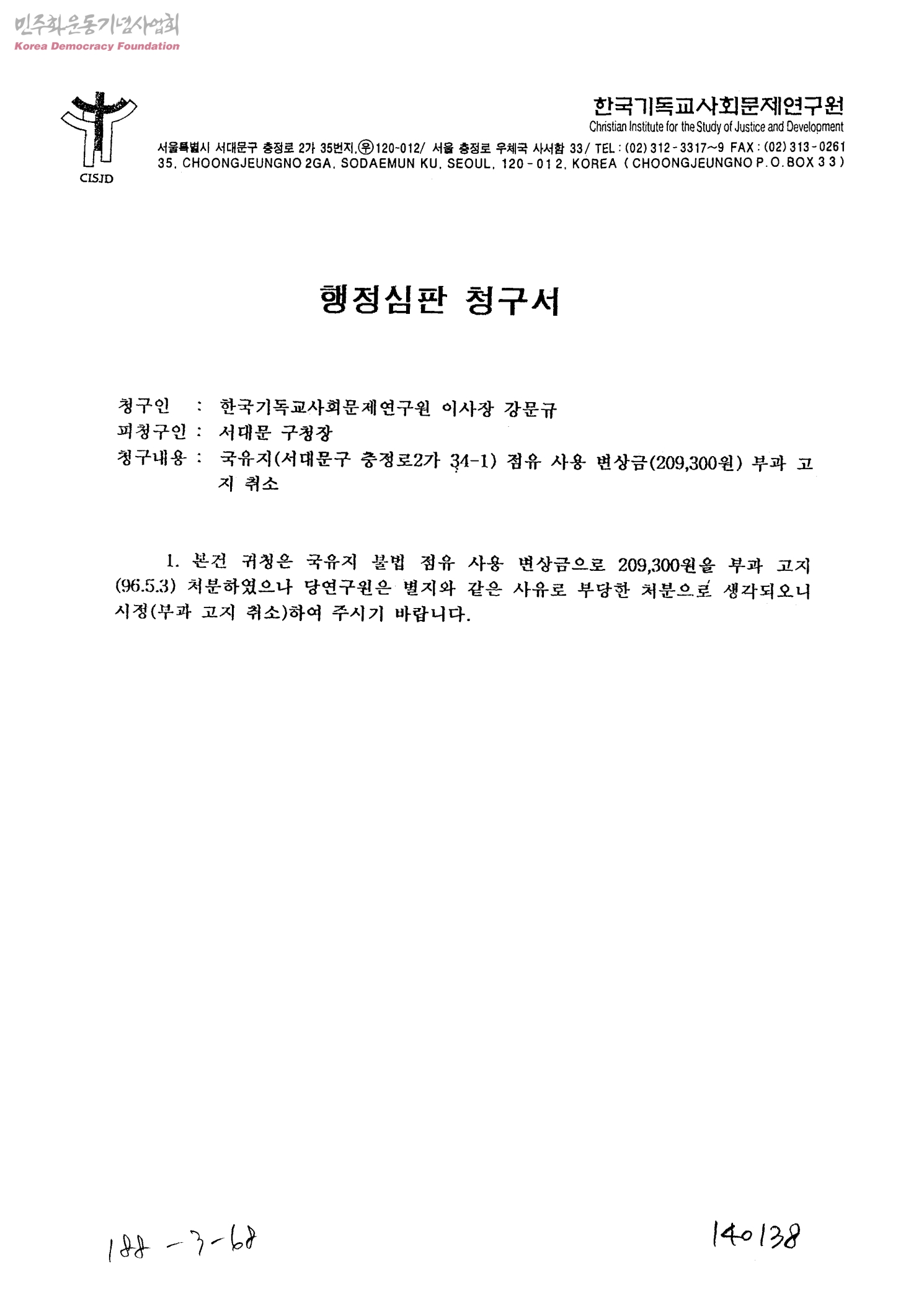 행정심판 청구서-국유지(서대문구 충정로2가 34-1) 점유사용 변상금(209,300원) 부과 고지 취소