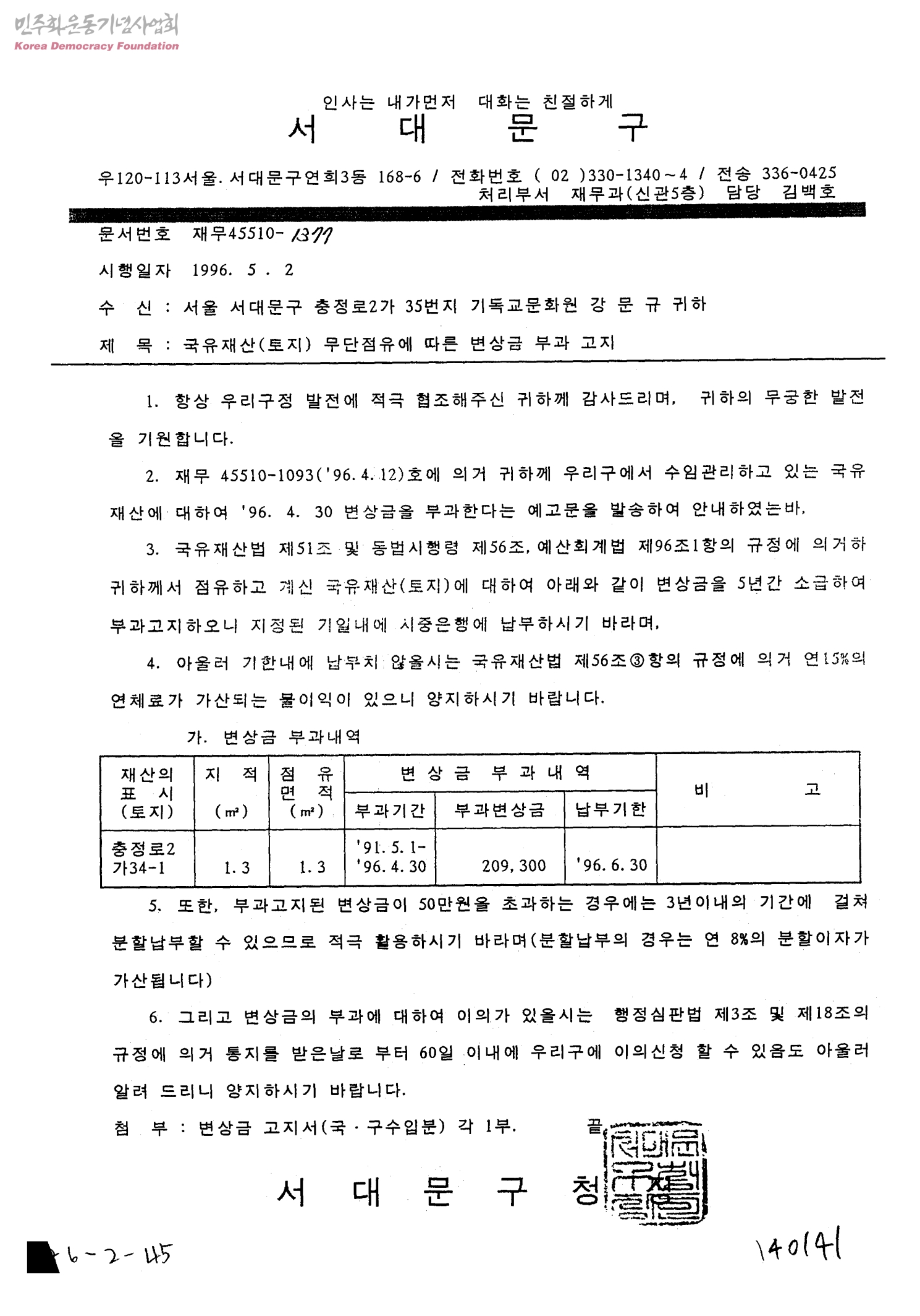 국유재산(토지) 무단점유에 따른 변상금 부과 고지[수신:강문규]