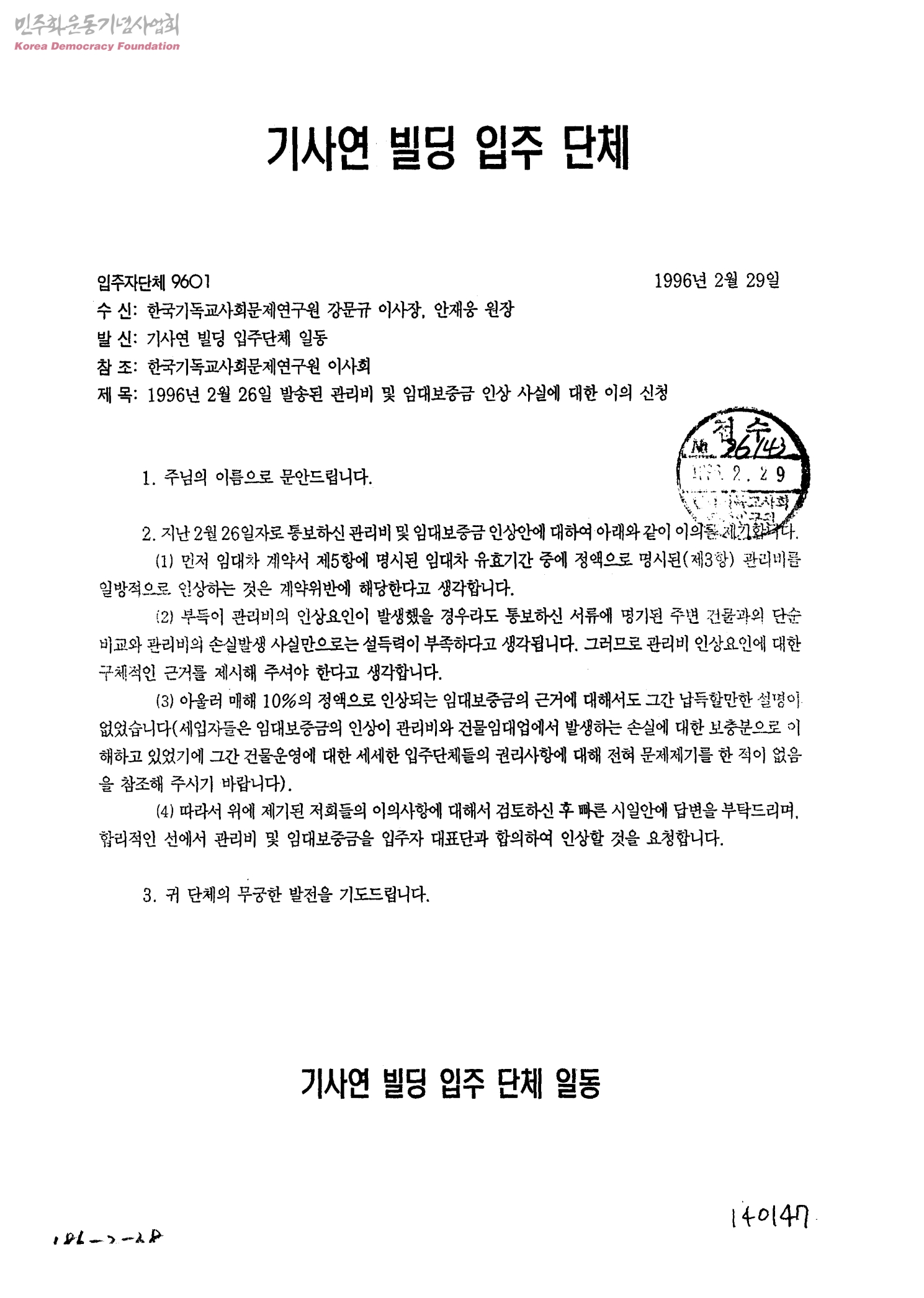 1996년 2월 26일 발송된 관리비 및 임대보증금 인상 사실에 대한 이의 신청[수신:한국기독교사회문제연구원 강문규 이사장, 안재웅 원장, 발신:기사연 빌딩 입주단체 일동]