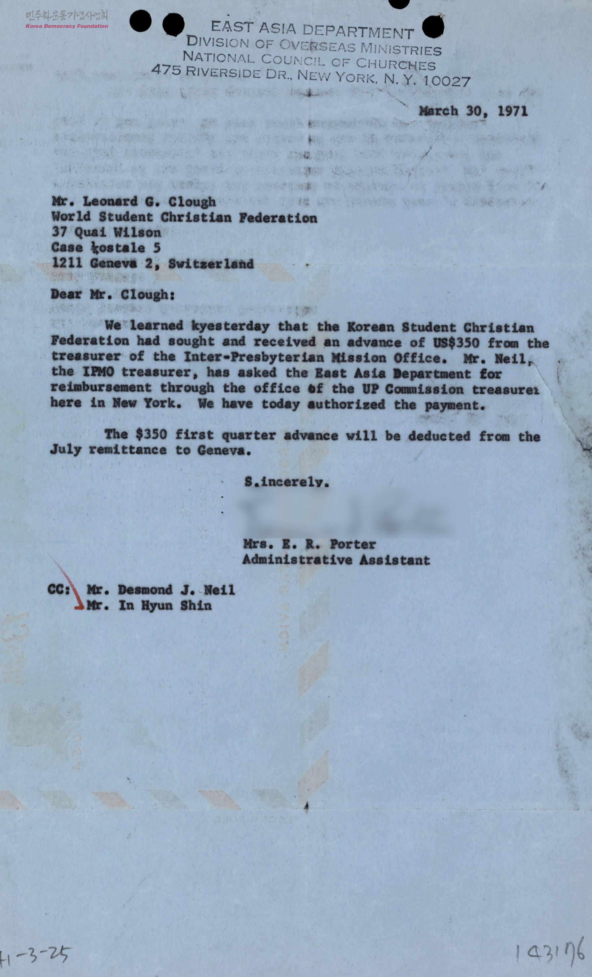 [Mr. Leonard G. Clough WSCF에 보내는 문서]
