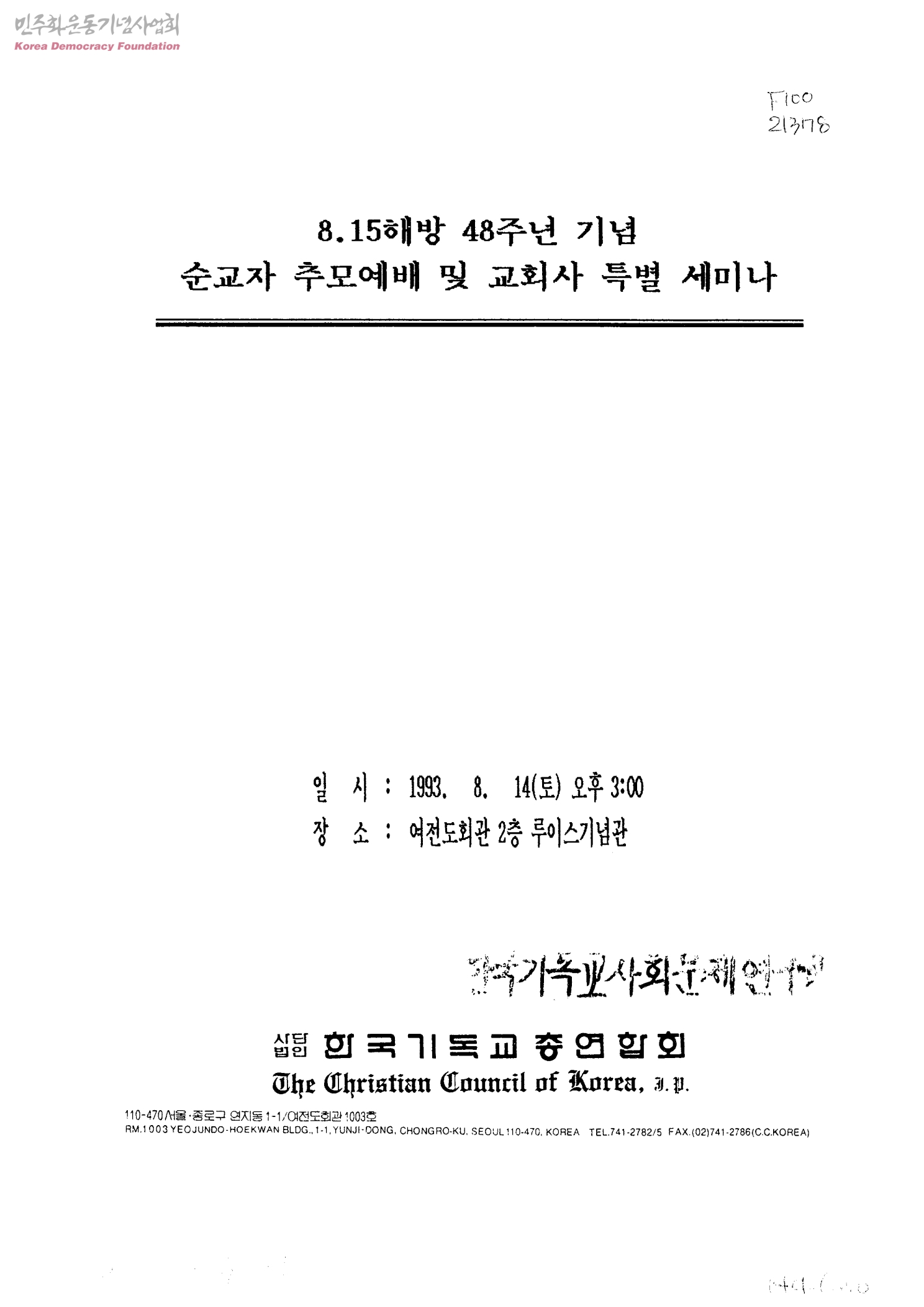 8.15해방 28주년 기념 순교자 추모예배 및 교회사 특별 세미나
