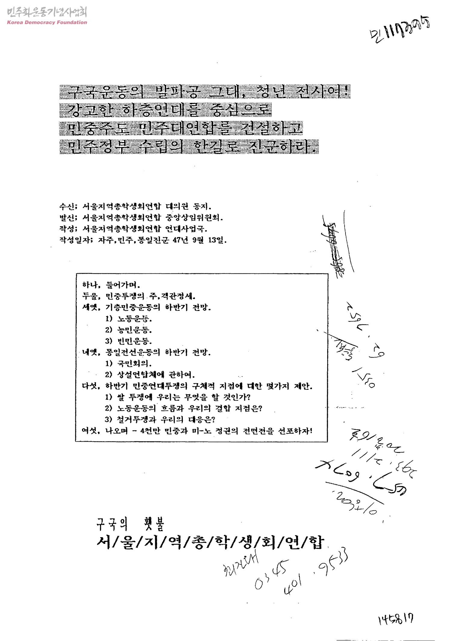 구국운동의 발파공 그대, 청년 전사여 강고한 하층연대를 중심으로 민중주도 민주대연합을 건설하고 민주정부 수립의 한길로 진군하라