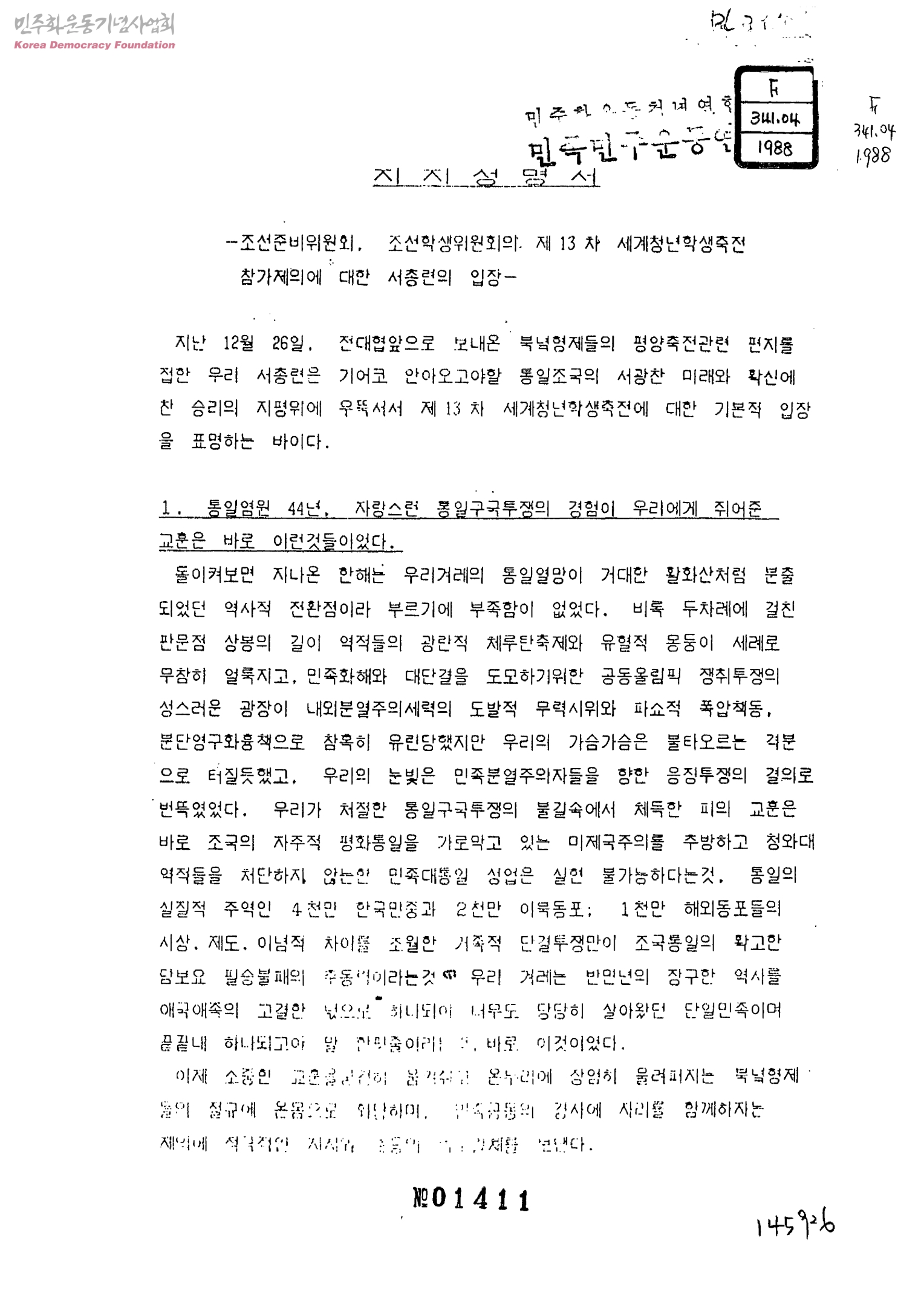 지지성명서 - 조선준비위원회, 조선학생위원회의 제13차 세계청년학생축전 참가제의에 대한 서총련의 입장