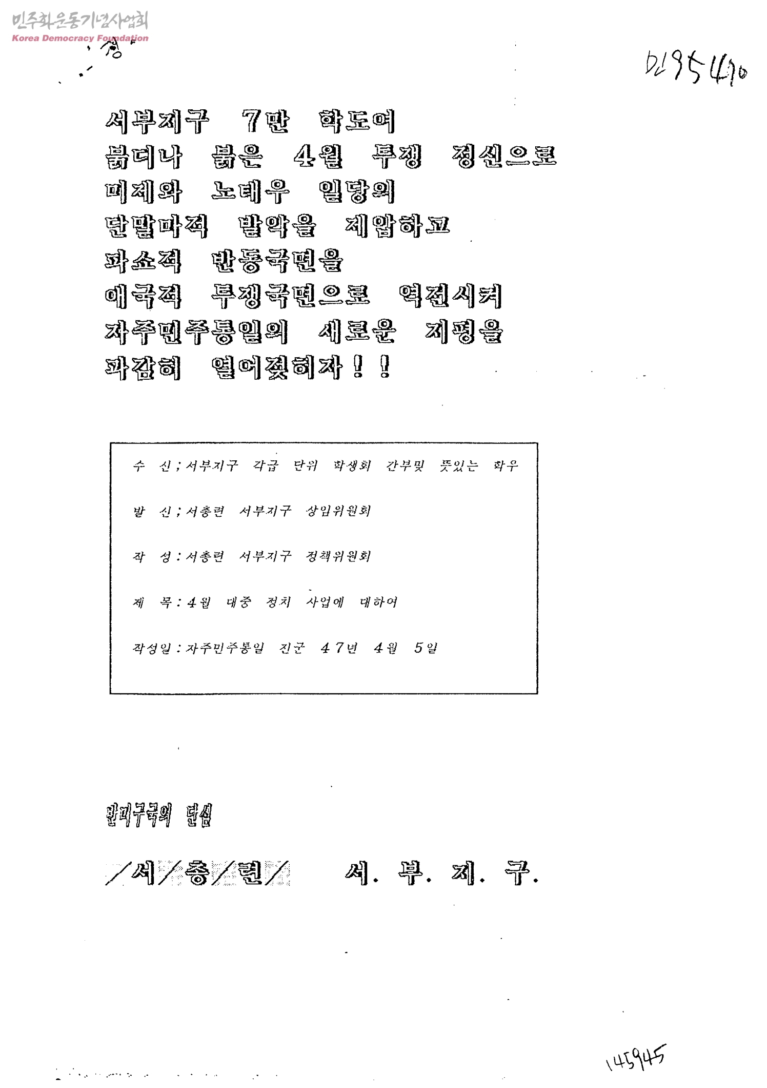 4월 대중 정치 사업에 대하여[발신:서총련서부지구상임위원회 수신:서부지구각급단위학생회간부및뜻있는학우]