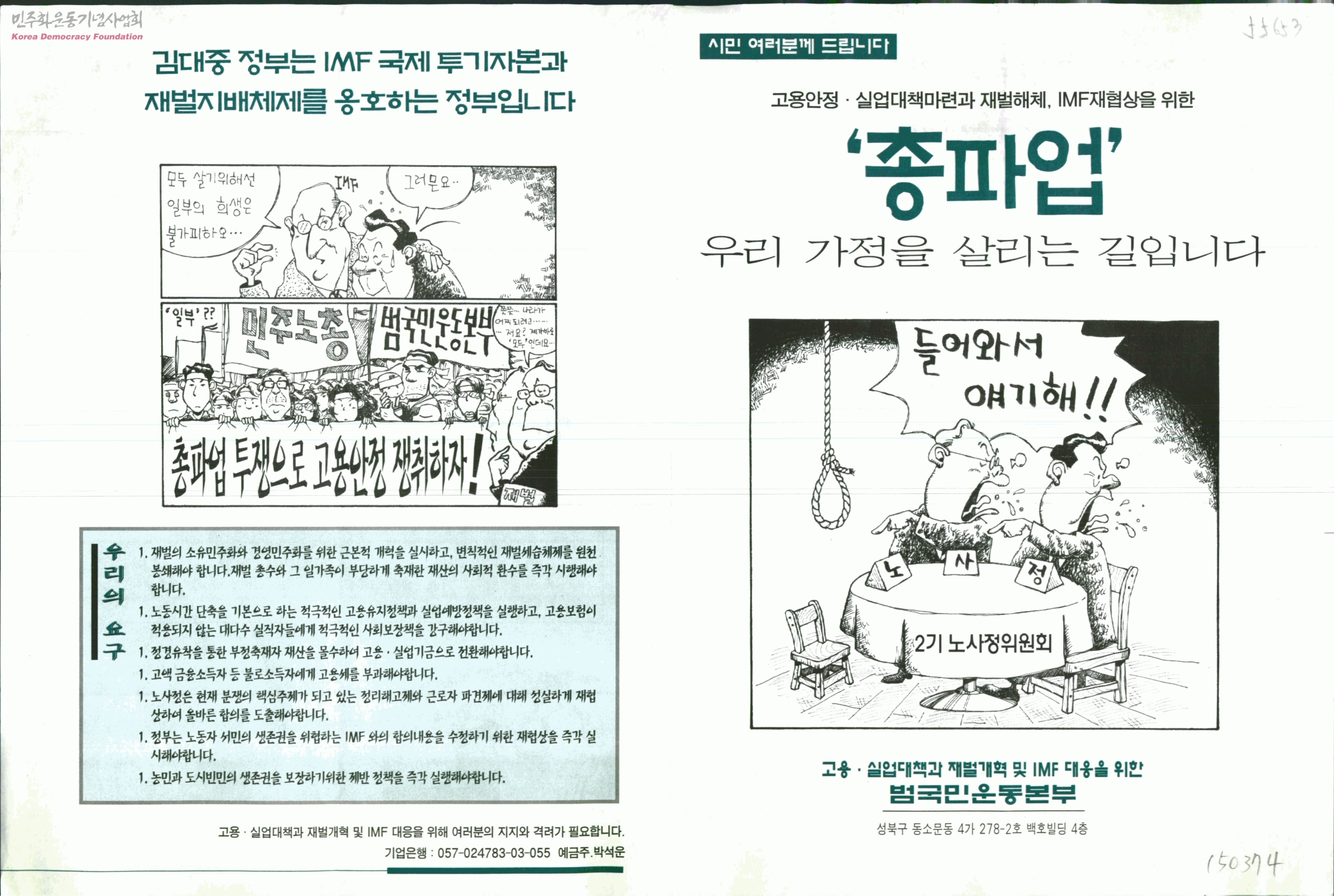 고용안정ㆍ실업대책마련과 재벌해체, IMF재협상을 위한 '총파업' 우리 가정을 살리는 길입니다