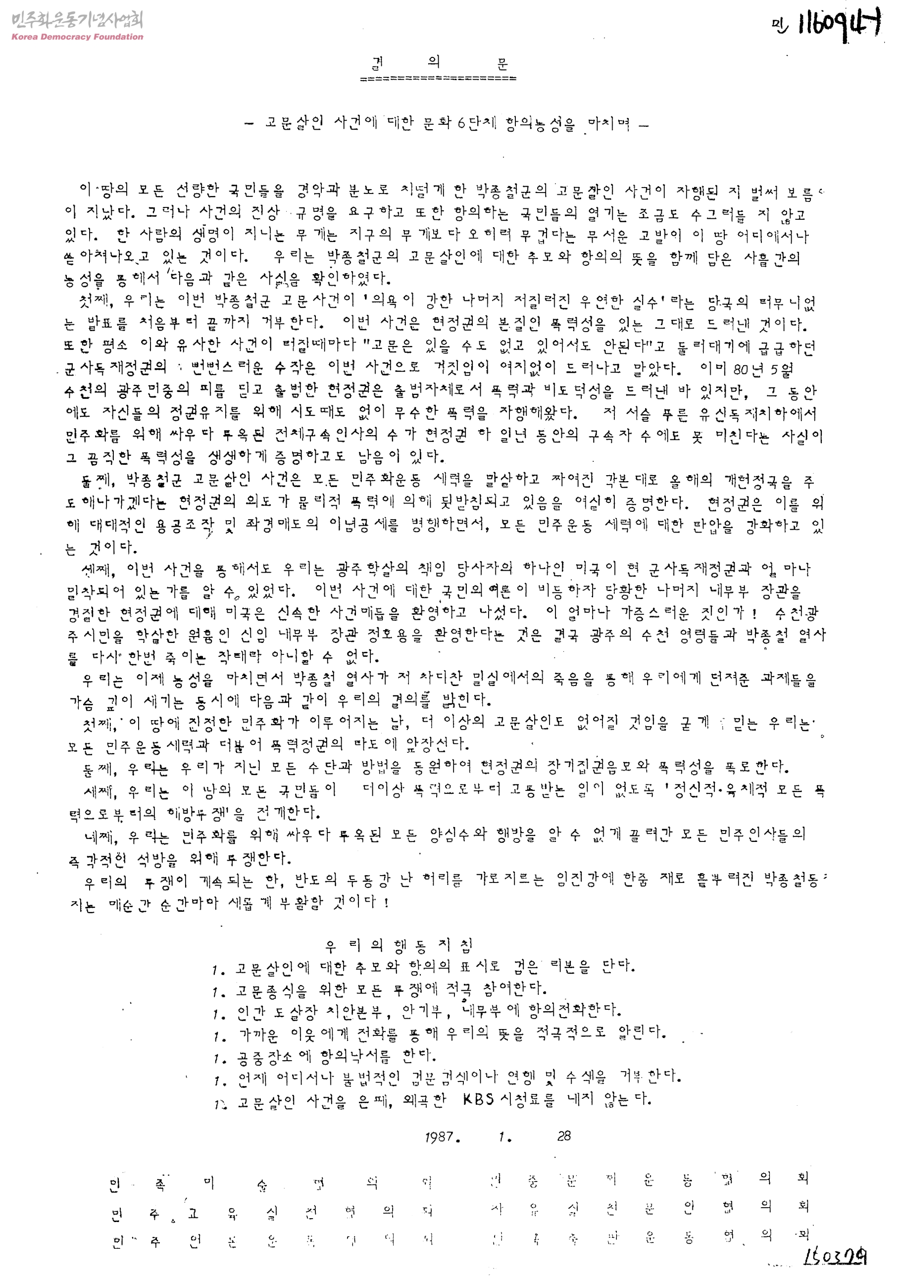 결의문-고문살인 사건에 대한 문화6단체 항의농성을 마치며