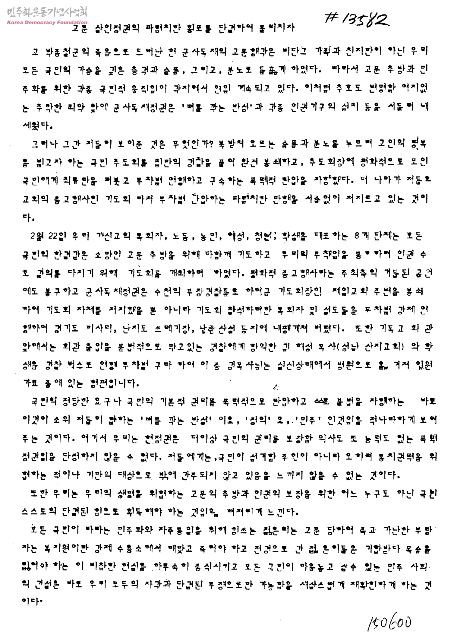 고문 살인정권의 파렴치한 횡포를 단결하여 물리치자