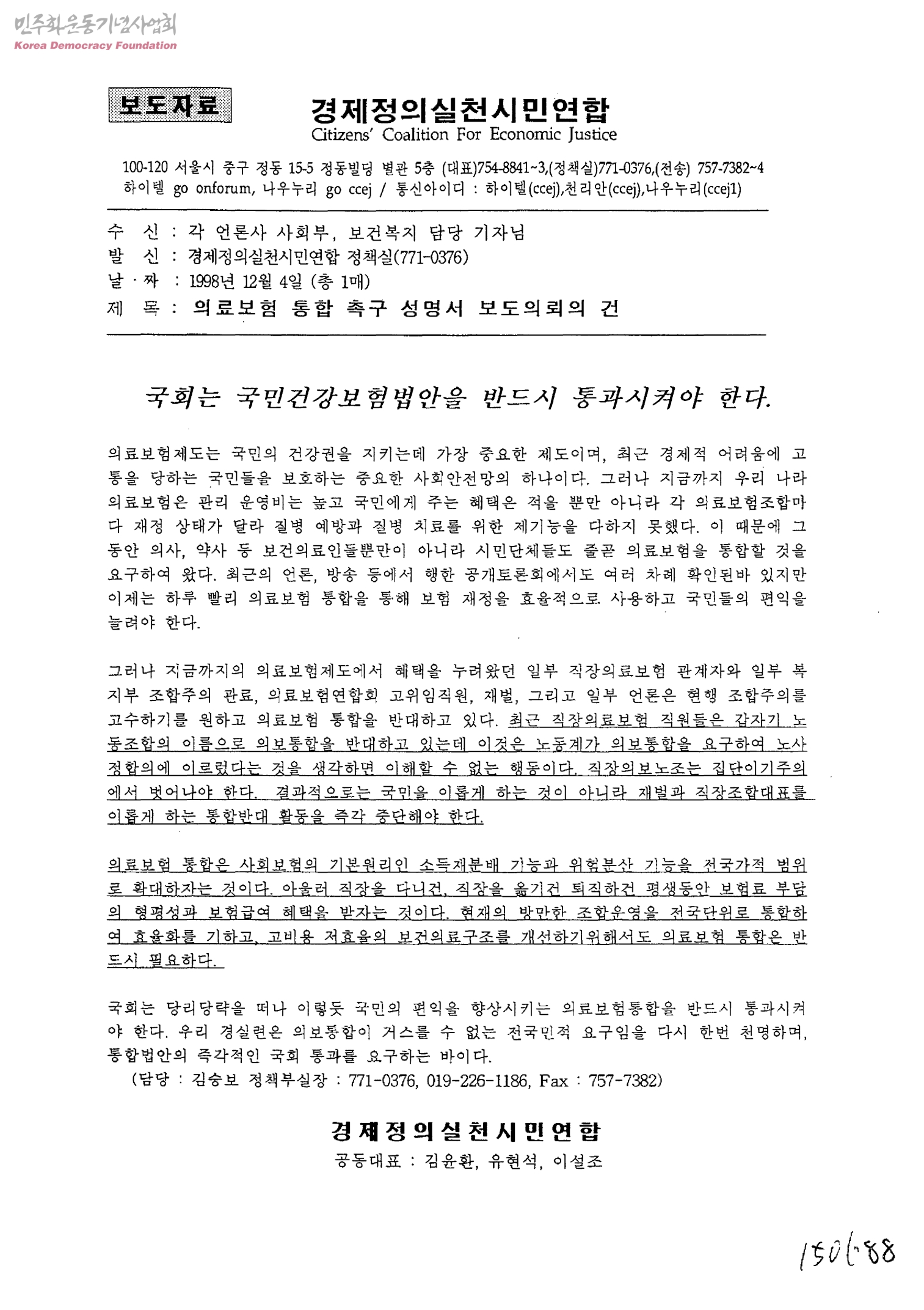 보도자료-의료보험 통합 촉구 성명서 보도의뢰의 건[수신:각 언론사 사회부,보건복지 담당 기자님]