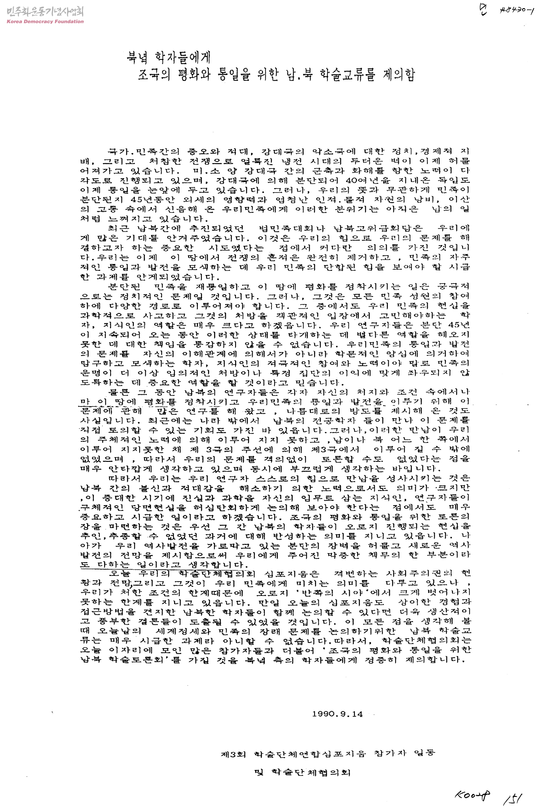 북녁 학자들에게 조국의 평화와 통일을 위한 남,북 학술교류를 제의함
