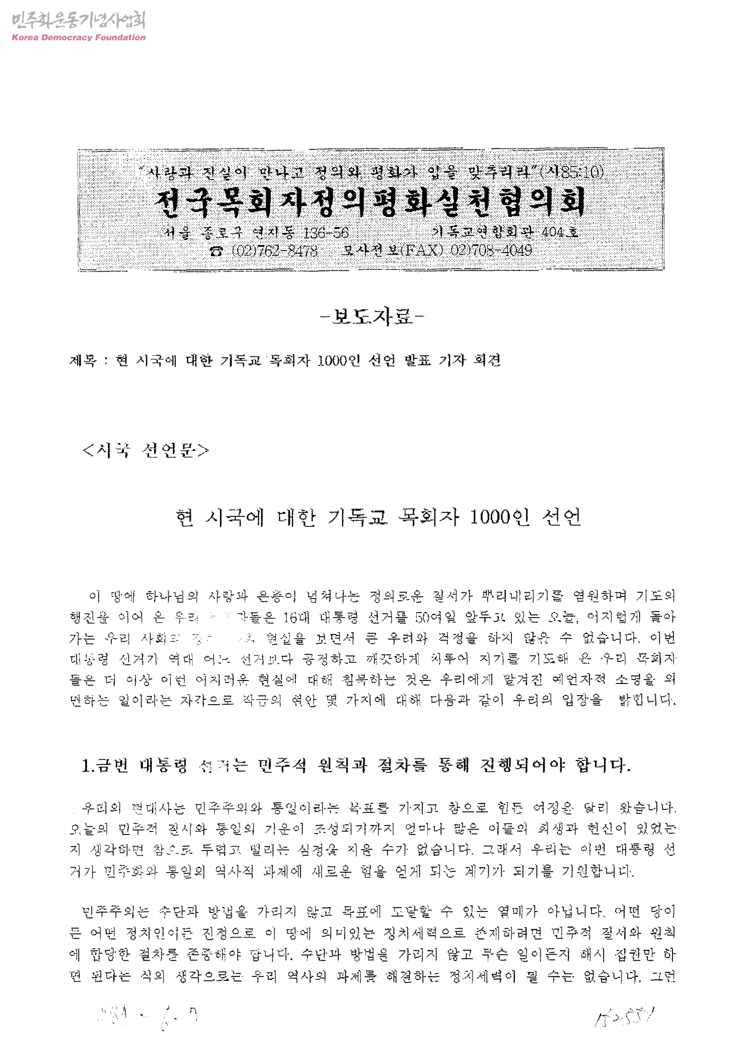 보도자료-현 시국에 대한 기독교 목회자 1000인선언 발표 기자 회견