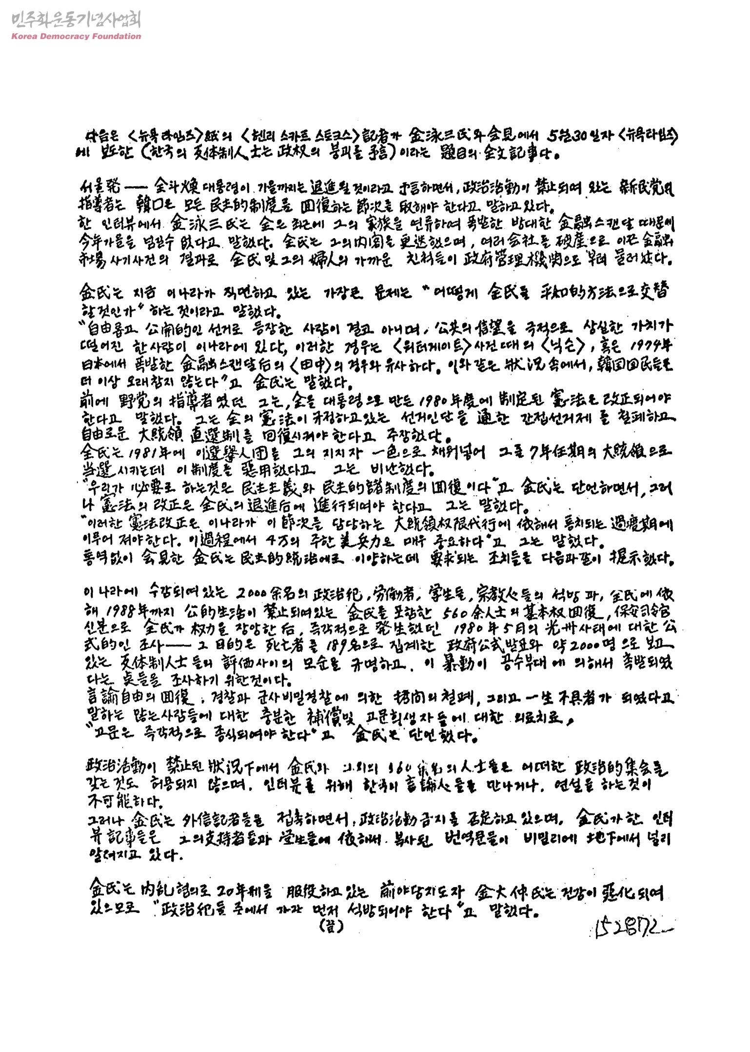 [한국의 반체제인사는 정권의 붕괴를 예언-뉴욕타임즈지 헨리스카트스토크스기자의 김영삼 회견문]