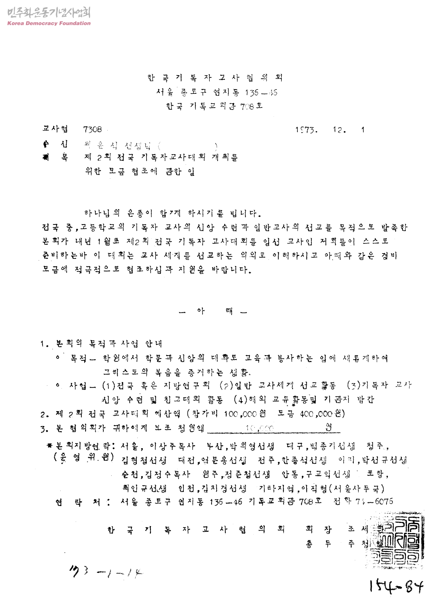 제2회 전국기독자교사대회 개최를 위한 모금협조에 관한 일[수신:최윤식선생님]
