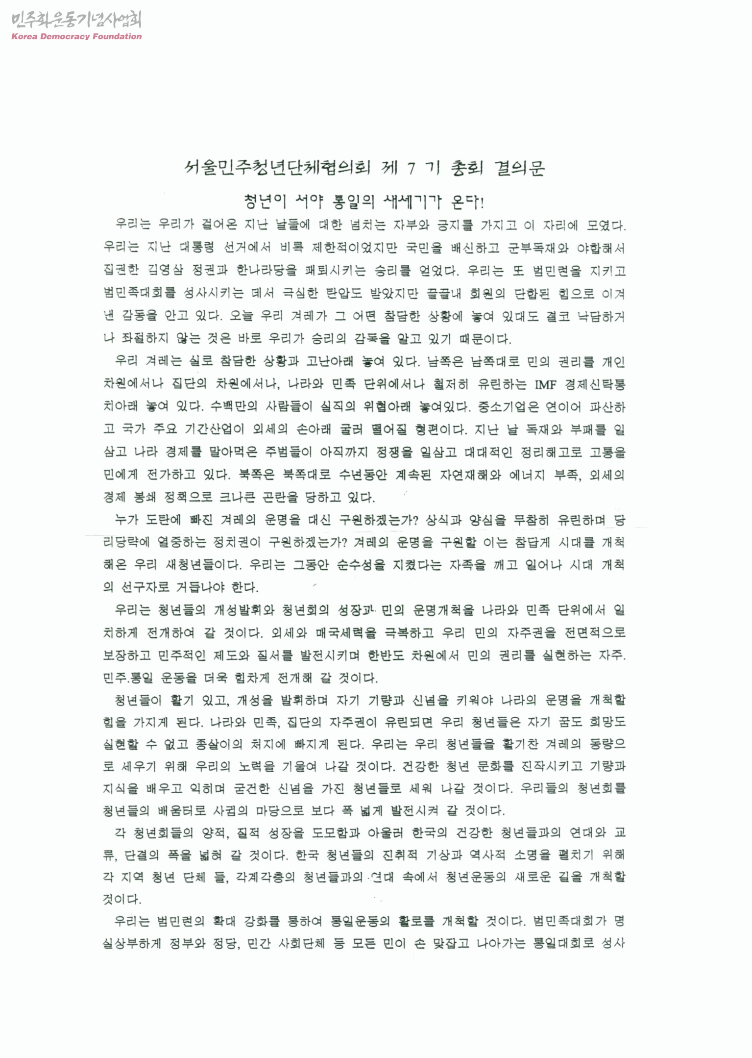 서울민주청년단체협의회 제7기 총회 결의문-청년이 서야 통일의 새세기가 온다