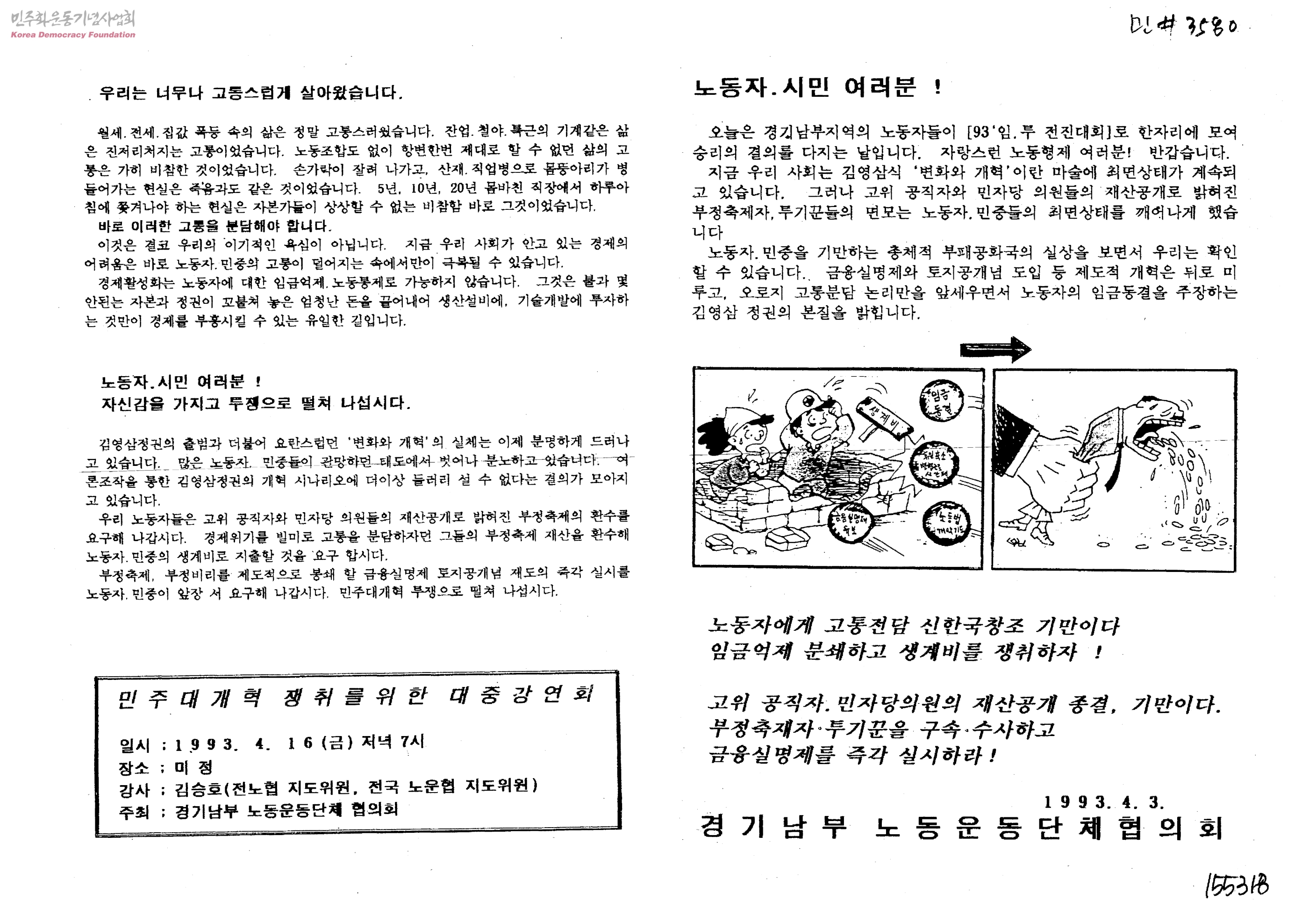 노동자.시민 여러분! 김영삼 정권은 금융실명제와 토지공개념 도입을 하라