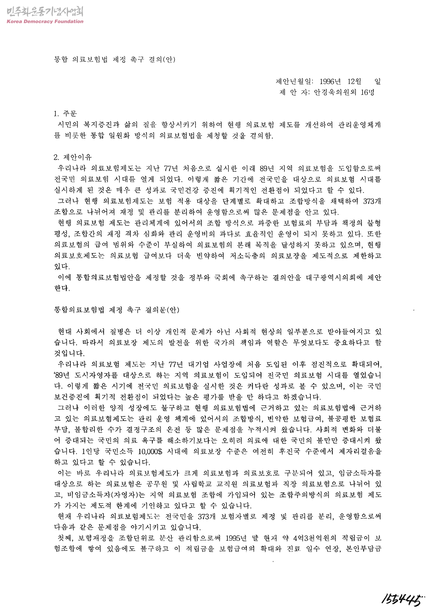 통합 의료보험범 제정 촉구 결의(안)
