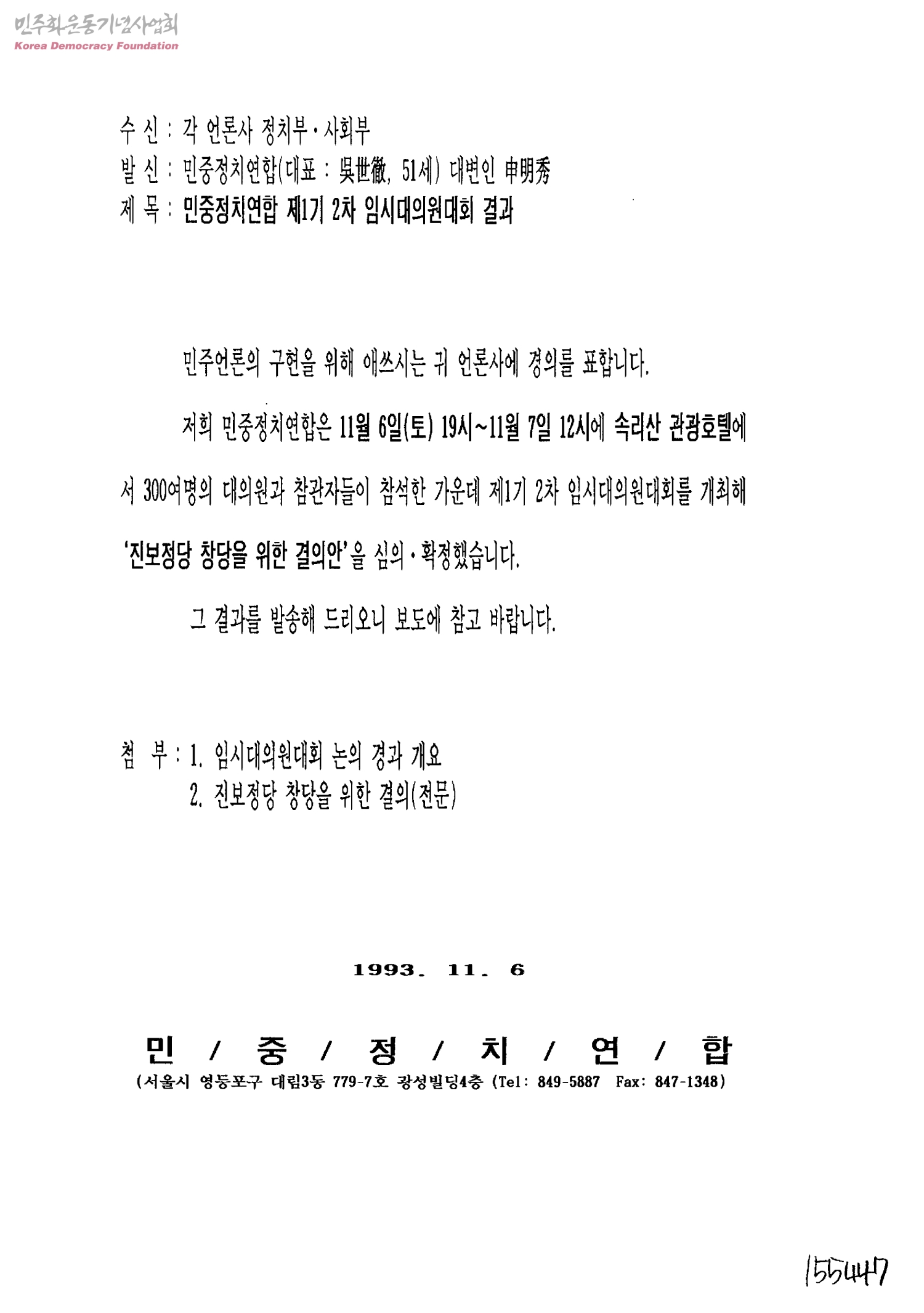민중정치연합 제1기 2차 임시대의원대회 결과[수신:각 언론사 정치부·사회부, 발신:민중정치연합대변인申明秀]