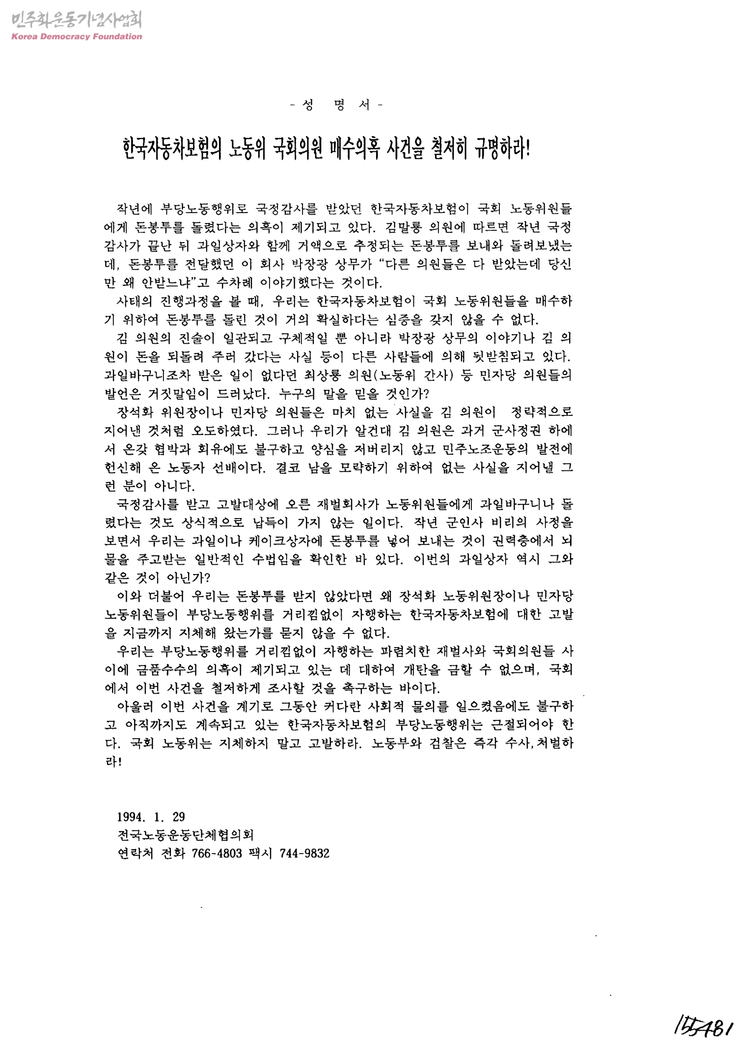 성명서-한국자동차보험의 노동위 국회의원 매수의혹 사건을 철저히 규명하라!-