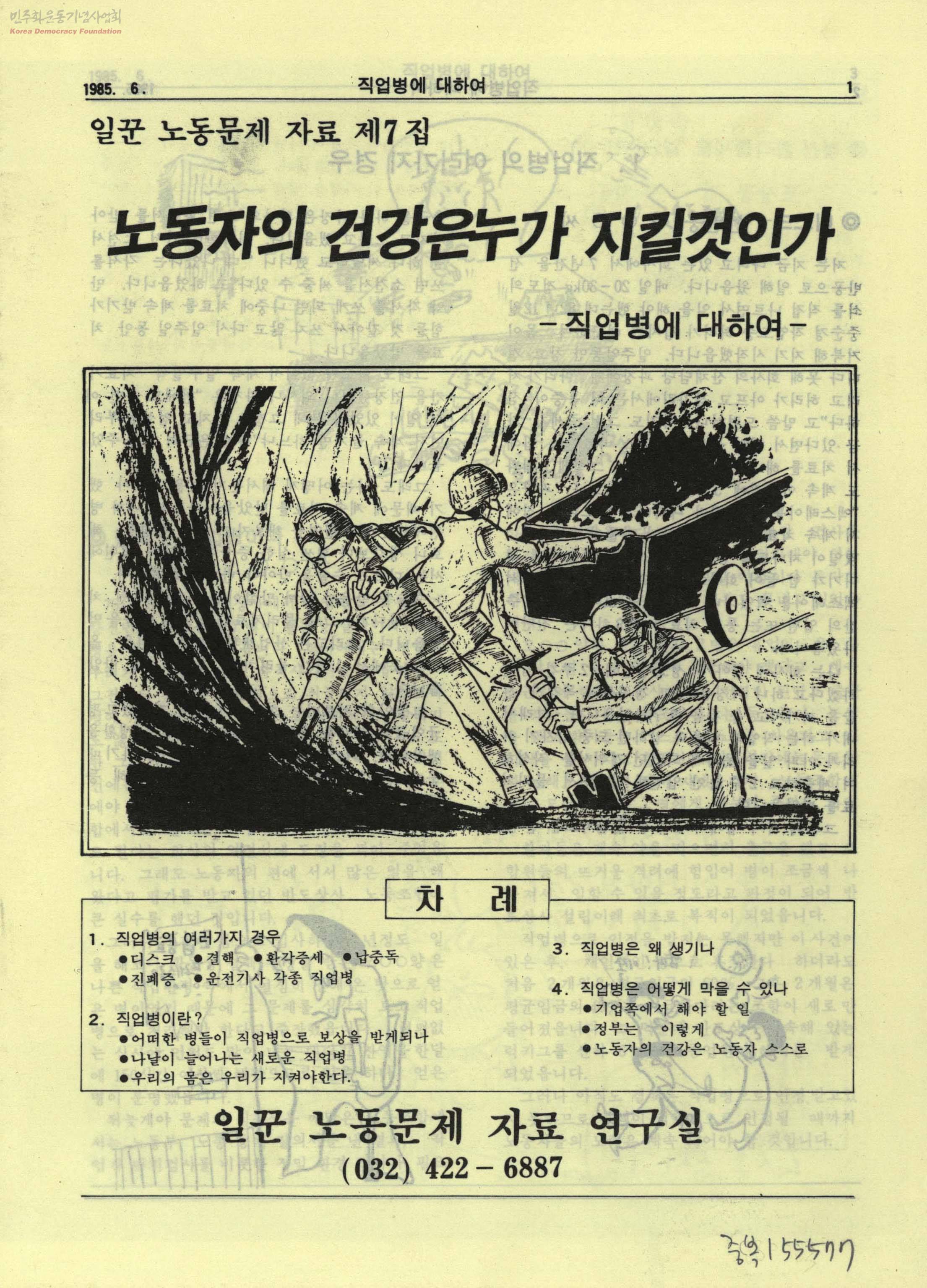 - 복음화를 바탕으로 하여 노동자들의 인권신장과 복지사회 건설에 기여한 인천기독교도시산업선교회 부설 '일꾼노동문제자료연구실'에서 발간한 노동자들이 노동의 현장이나 사회생활 속에서 부딪히는 문제를 올바르게 해결해 나갈 수 있는데 도움이 될 수 있는 자료집. -직업병의 여러가지 경우 -직업병이란? -직업병은 어떻게 막을 수 있나 등.