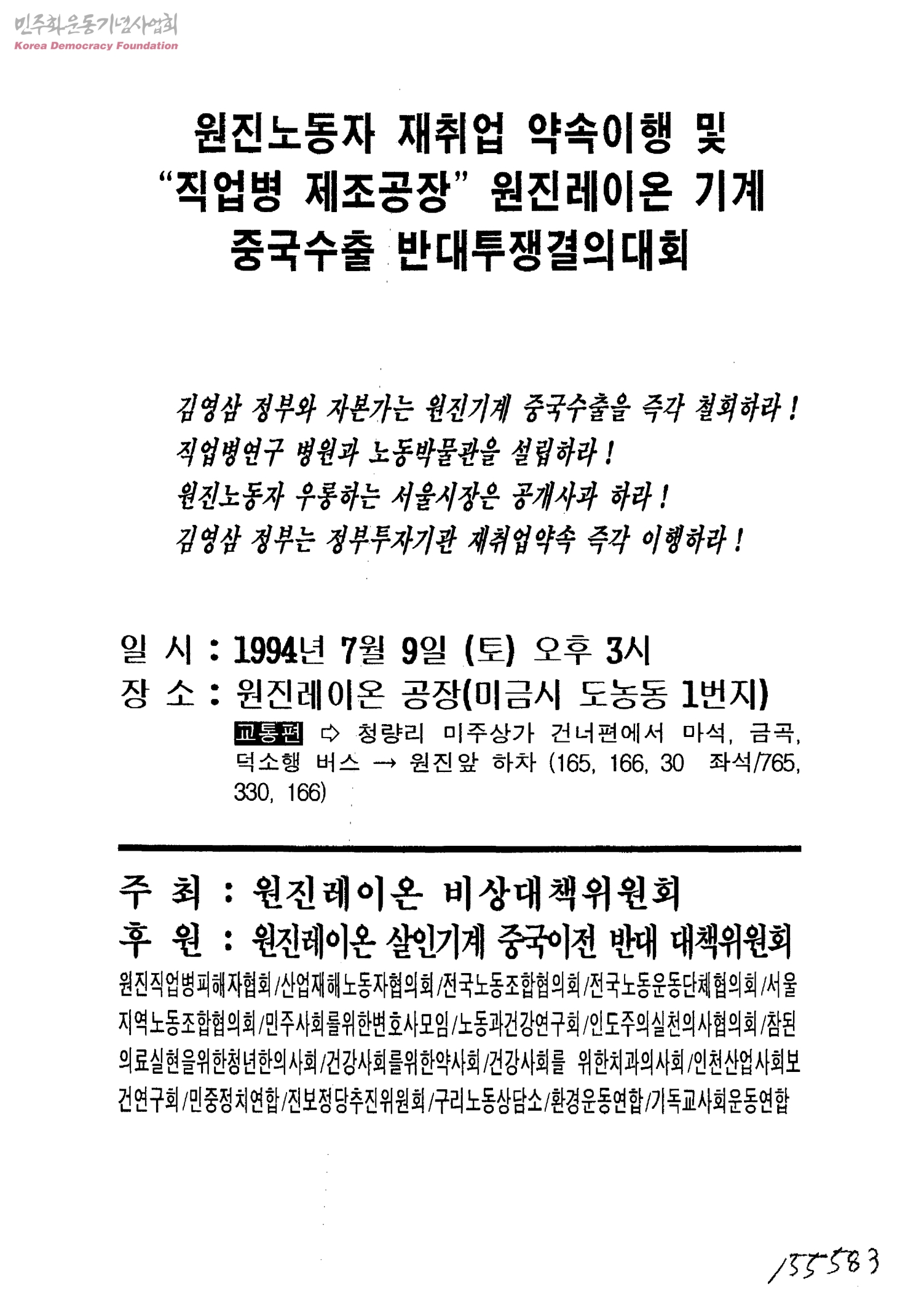 원진노동자 재취업 약속이행 및 직업병 제조공장 원진레이온 기계 중국수출 반대투쟁결의대회