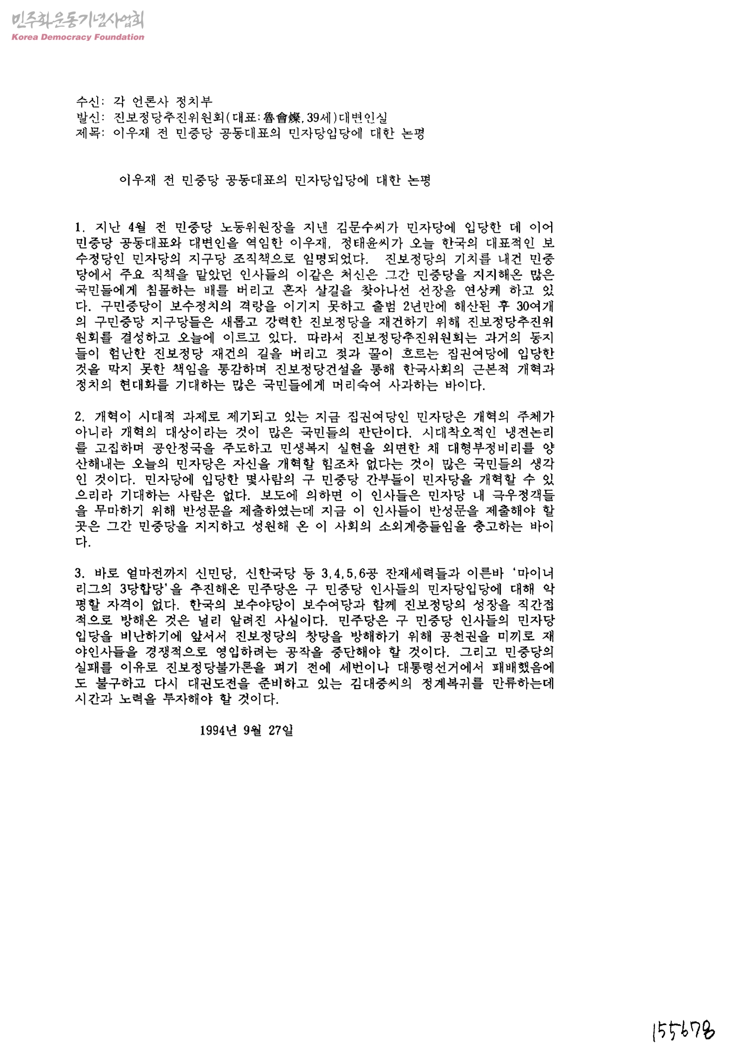 이우재 전 민중당 공동대표의 민자당입장에 대한 논평[수신:각 언론사 정치부, 발신:진보정당추진위원회 대변인실]