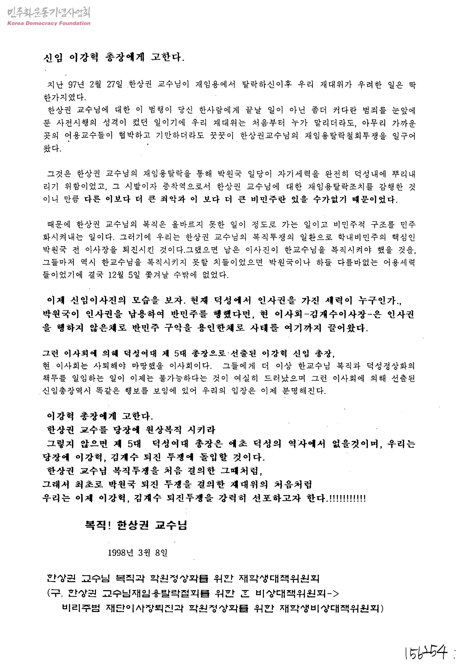 - 한상권교수님복직과학원정상화를위한재학생대책위원회