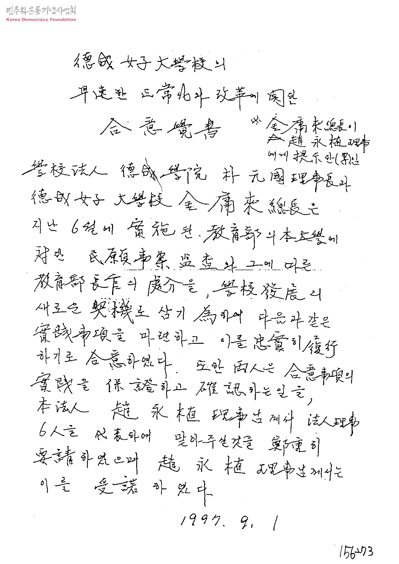 德成女子大學校의 早速한 正常化와 改革에 關한 合意覺書