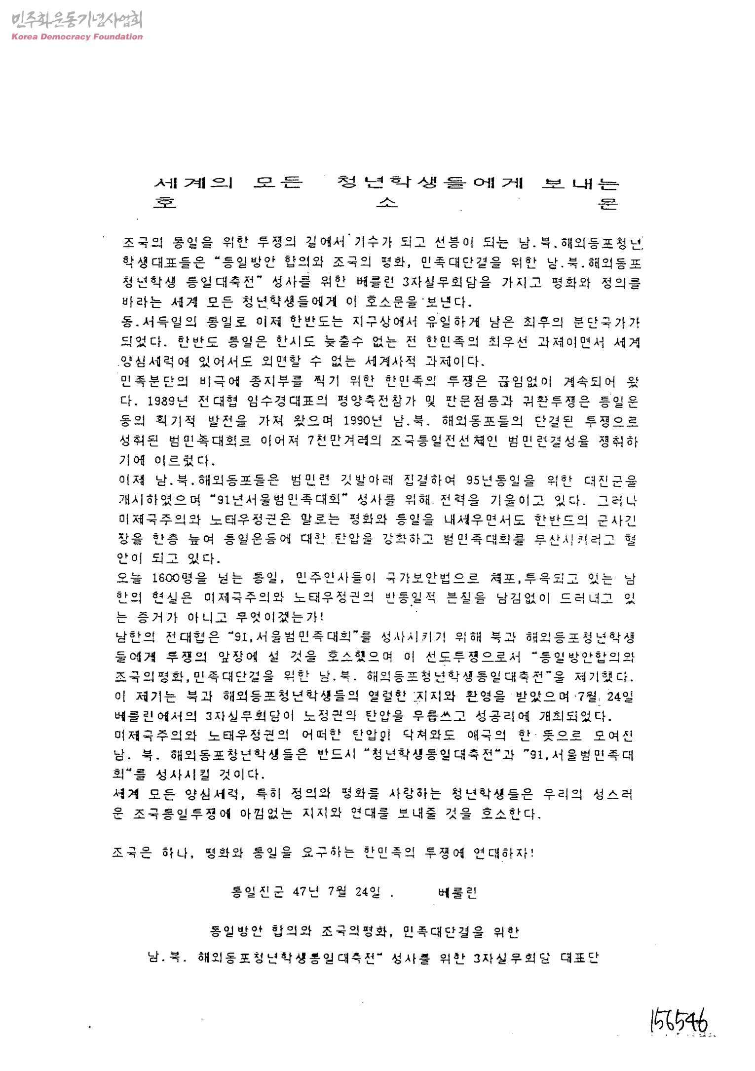 - 통일방안합의와조국의평화민족대단결을위한남북해외동포청년학생통일대축전성사를위한3자실무회담대표단