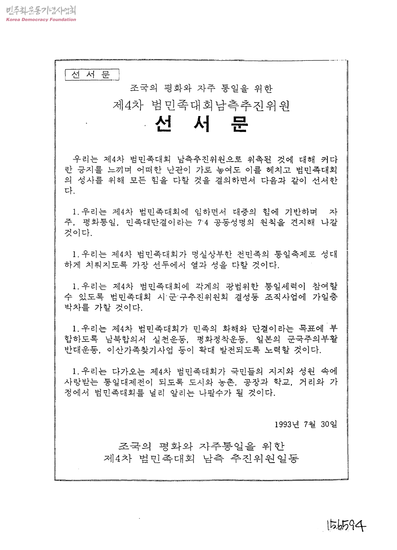 조국의 평화와 자주 통일을 위한 제4차 범민족대회남측추진위원 선서문