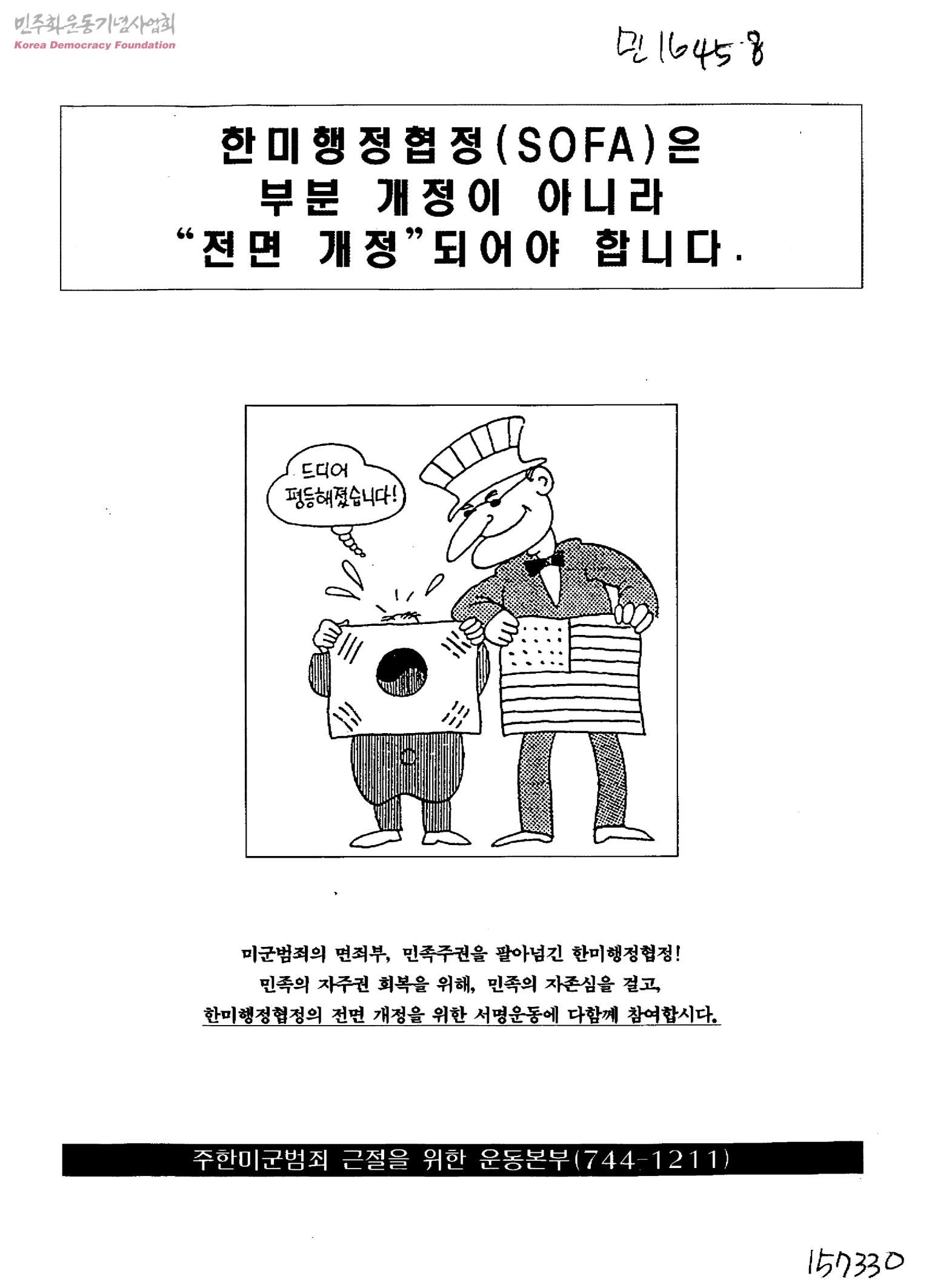 한미행정협정(SOFA)은 부분 개정이 아니라 전면 개정 되어야 합니다.