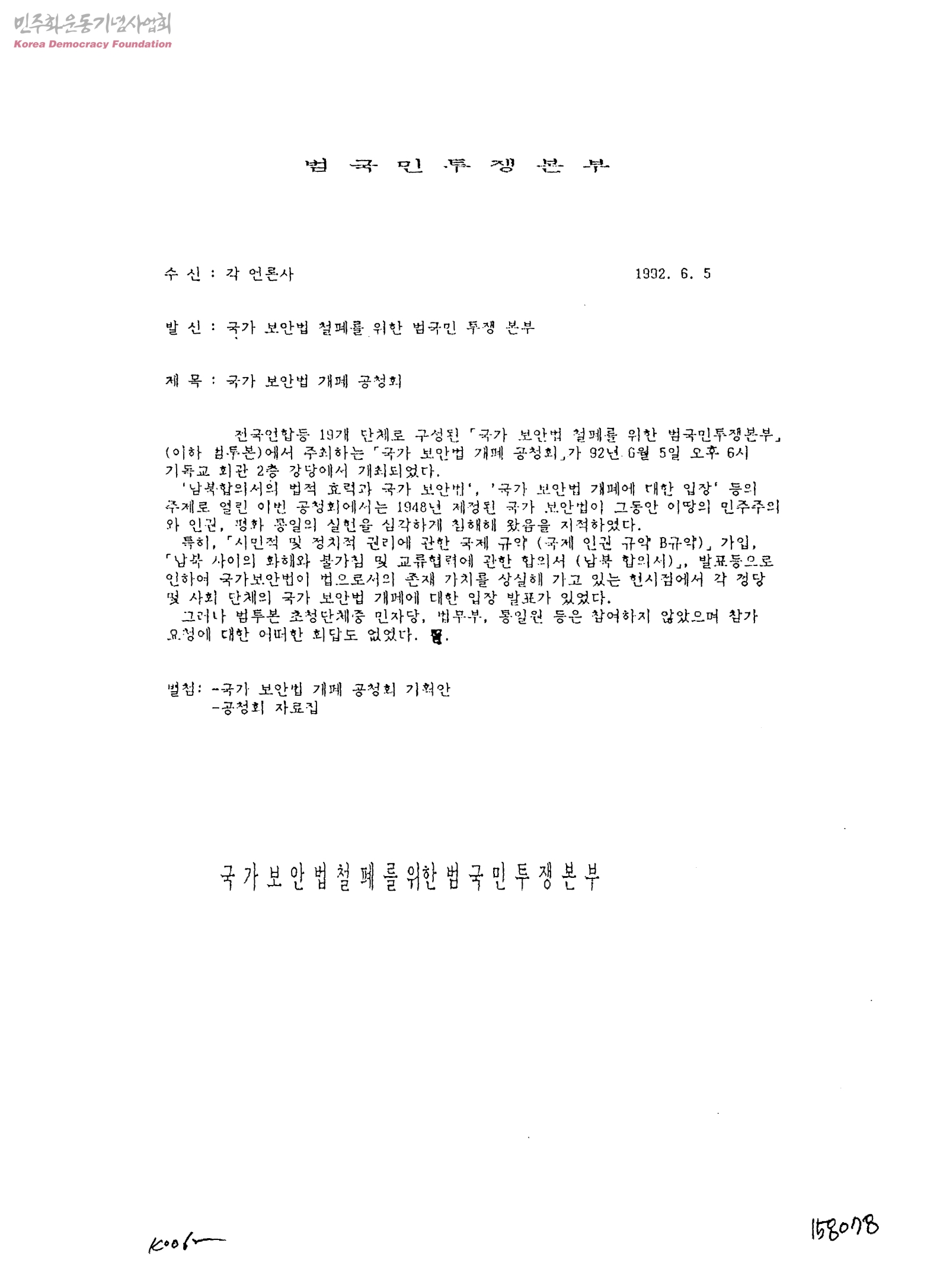 국가보안법 개폐 공청회(수신:각 언론사, 발신:국가보안법 철폐를 위한 범국민투쟁본부)
