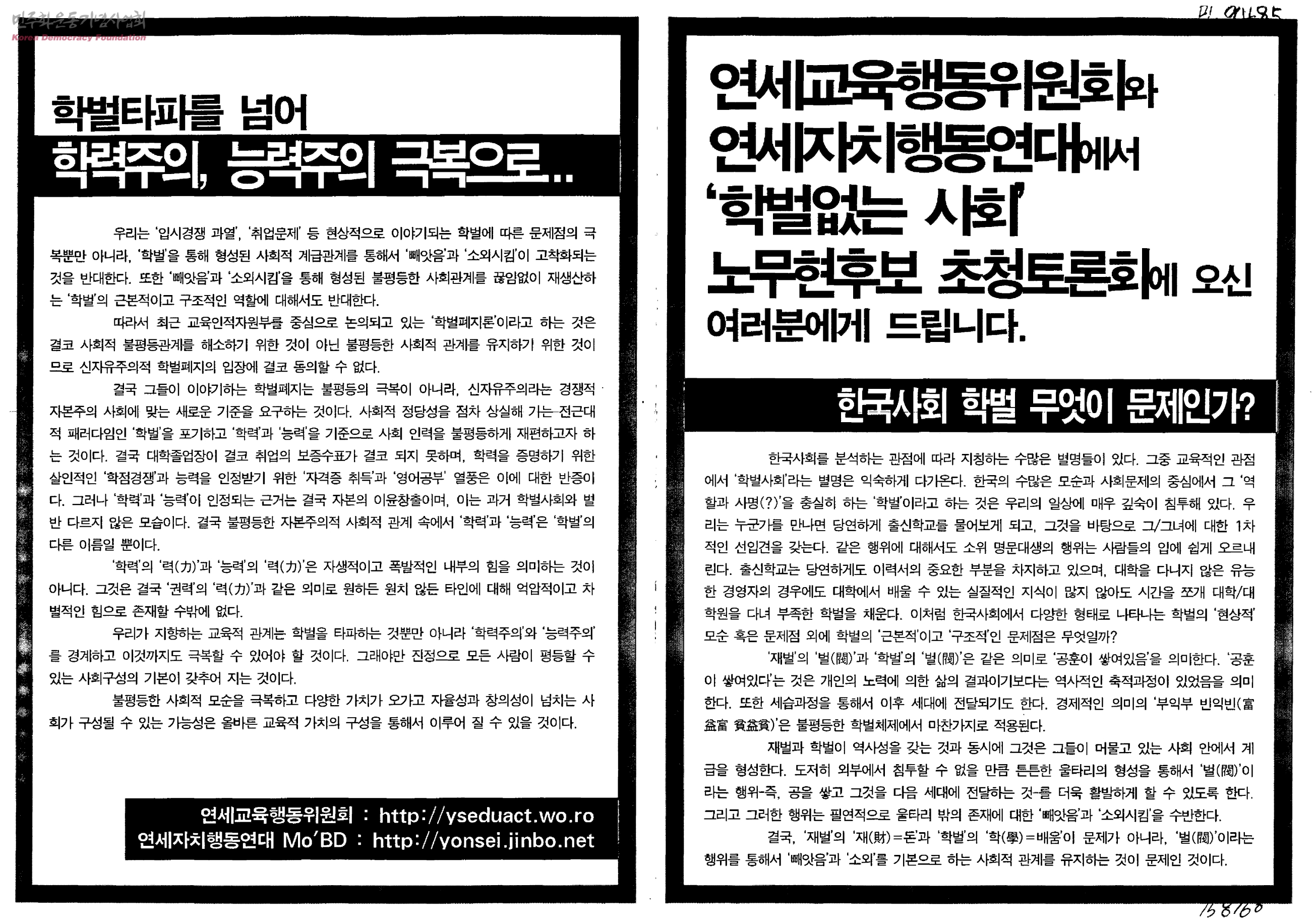 연세교육행동위원회와 연세자치행동연대에서 학벌없는 사회 노무현후보 초청토론회에 오신 여러분에게 드립니다-한국사회 학벌 무엇이 문제인가