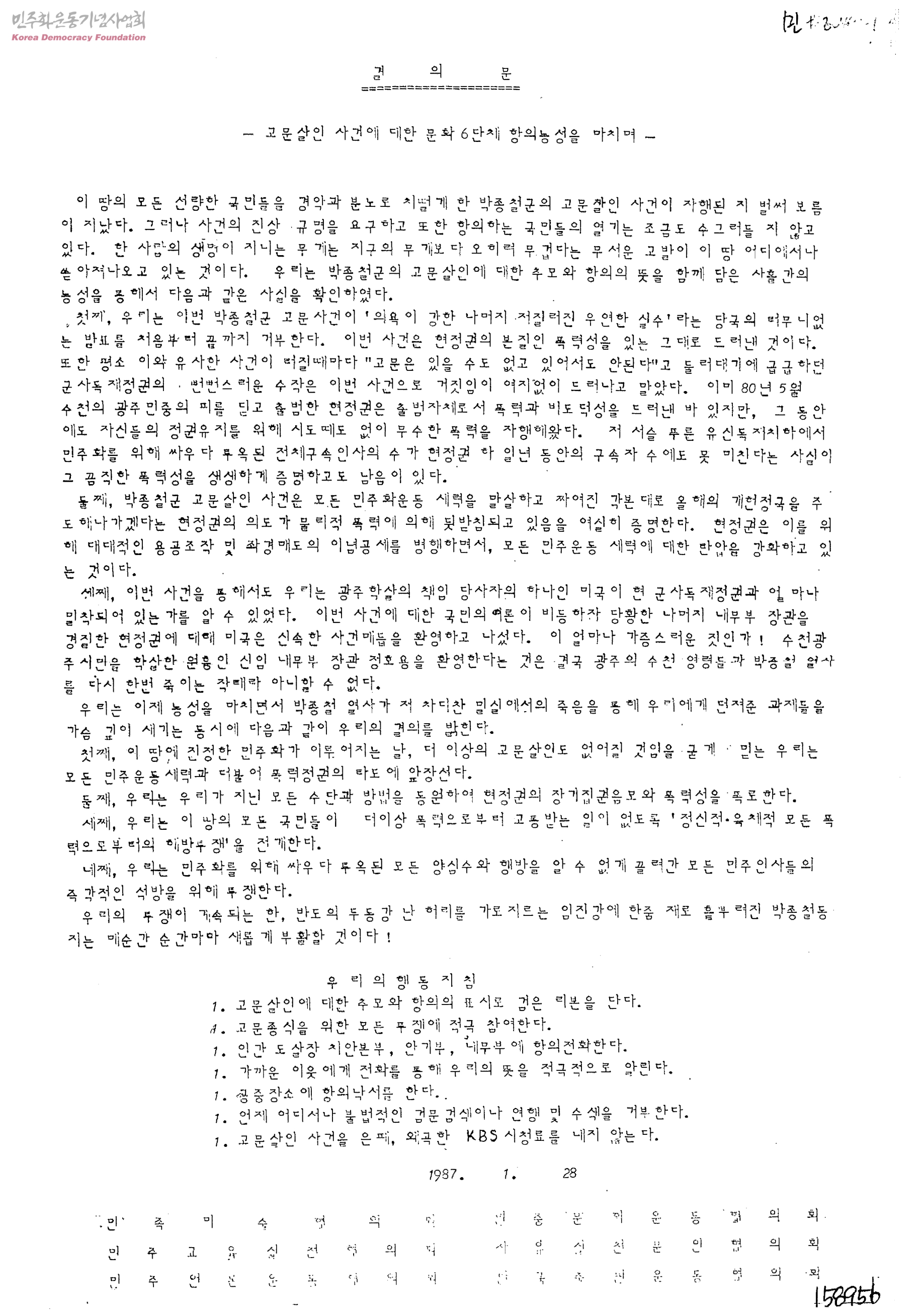 결의문-고문살인 사건에 대한 문화6단체 항의농성을 마치며