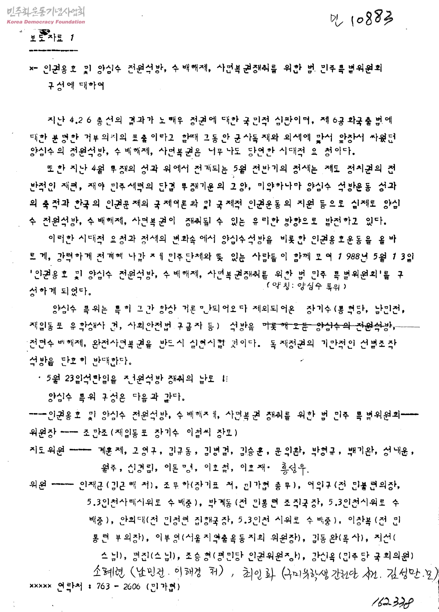 인권옹호 및 양심수 전원석방, 수배해제, 사면복권쟁취를 위한 범 민주특별위원회 구성에 대하여