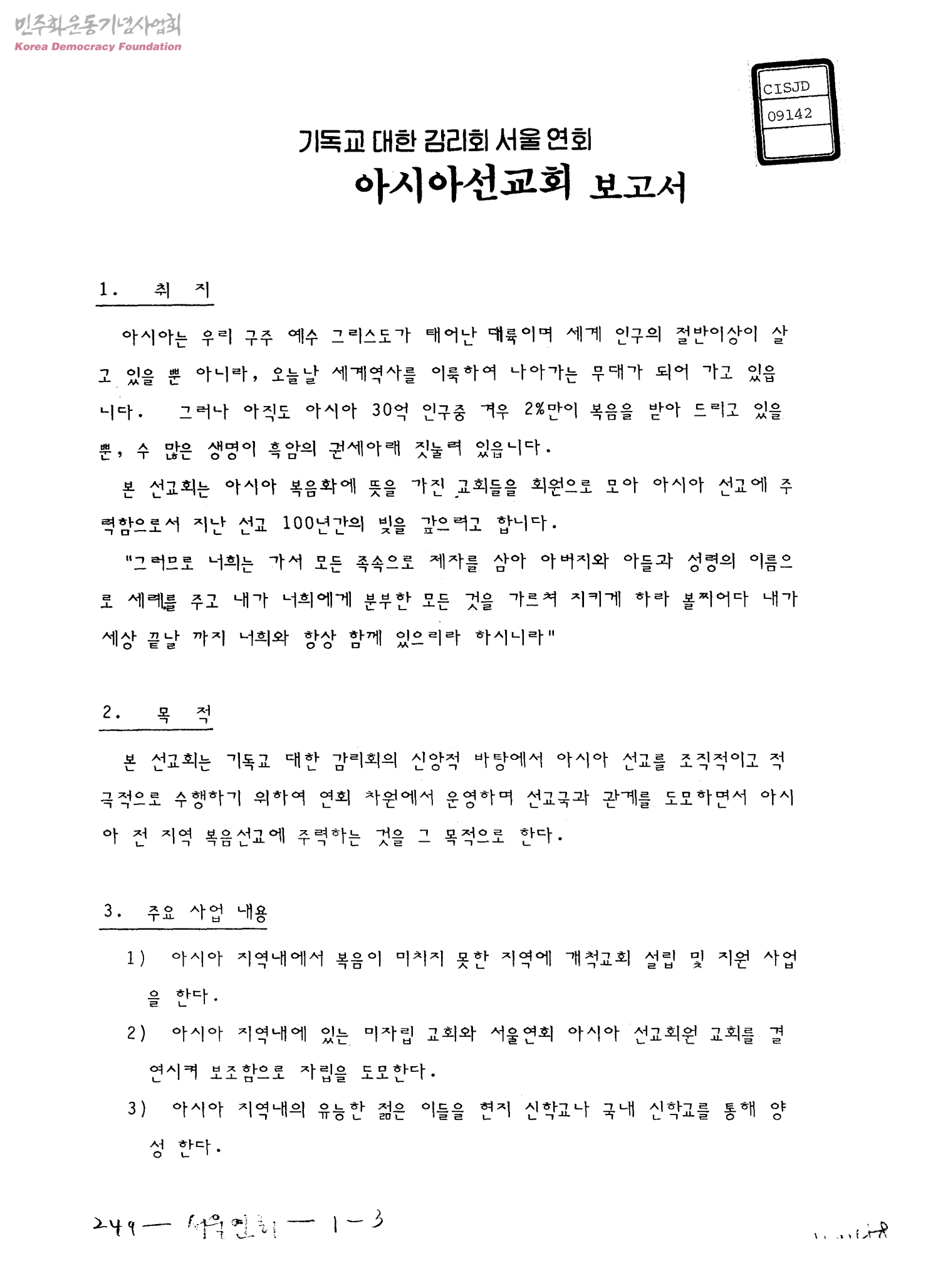 기독교 대한 감리회 서울 연회 아시아선교회 보고서