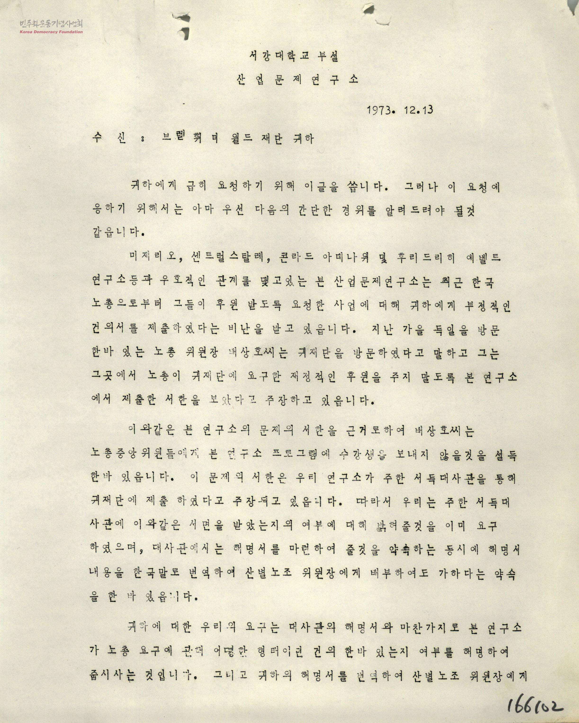 [서강대학교부설산업문제연구소이 브렐휘더월드재단에게 보내는 수발신문서]