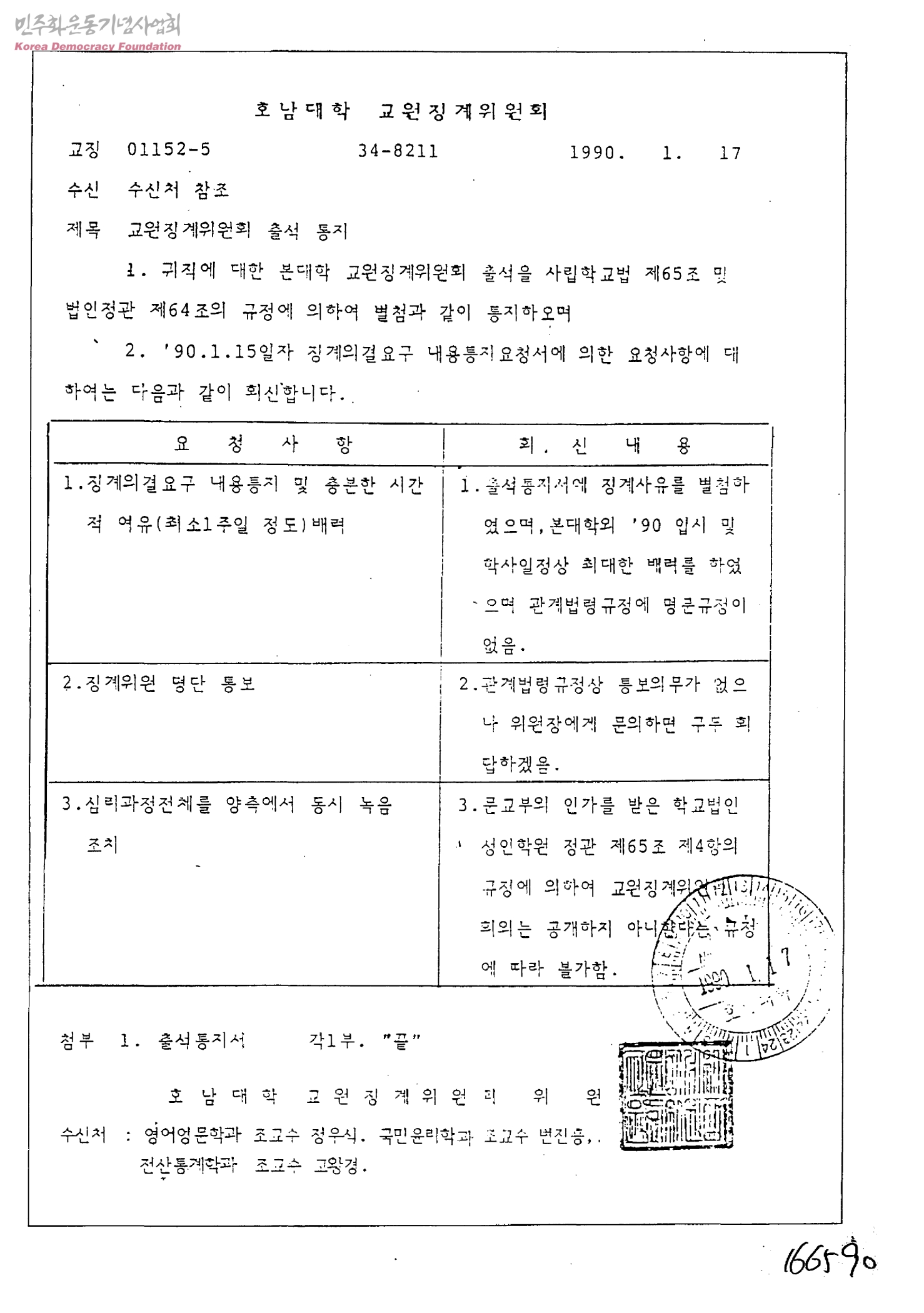 교원징계위원회 출석통지[수신:영어영문학과 조교수 정우식, 국민윤리학과 조교수 변진홍, 전산통계학과 조교수 고왕경, 발신:호남대학교원징계위원회]