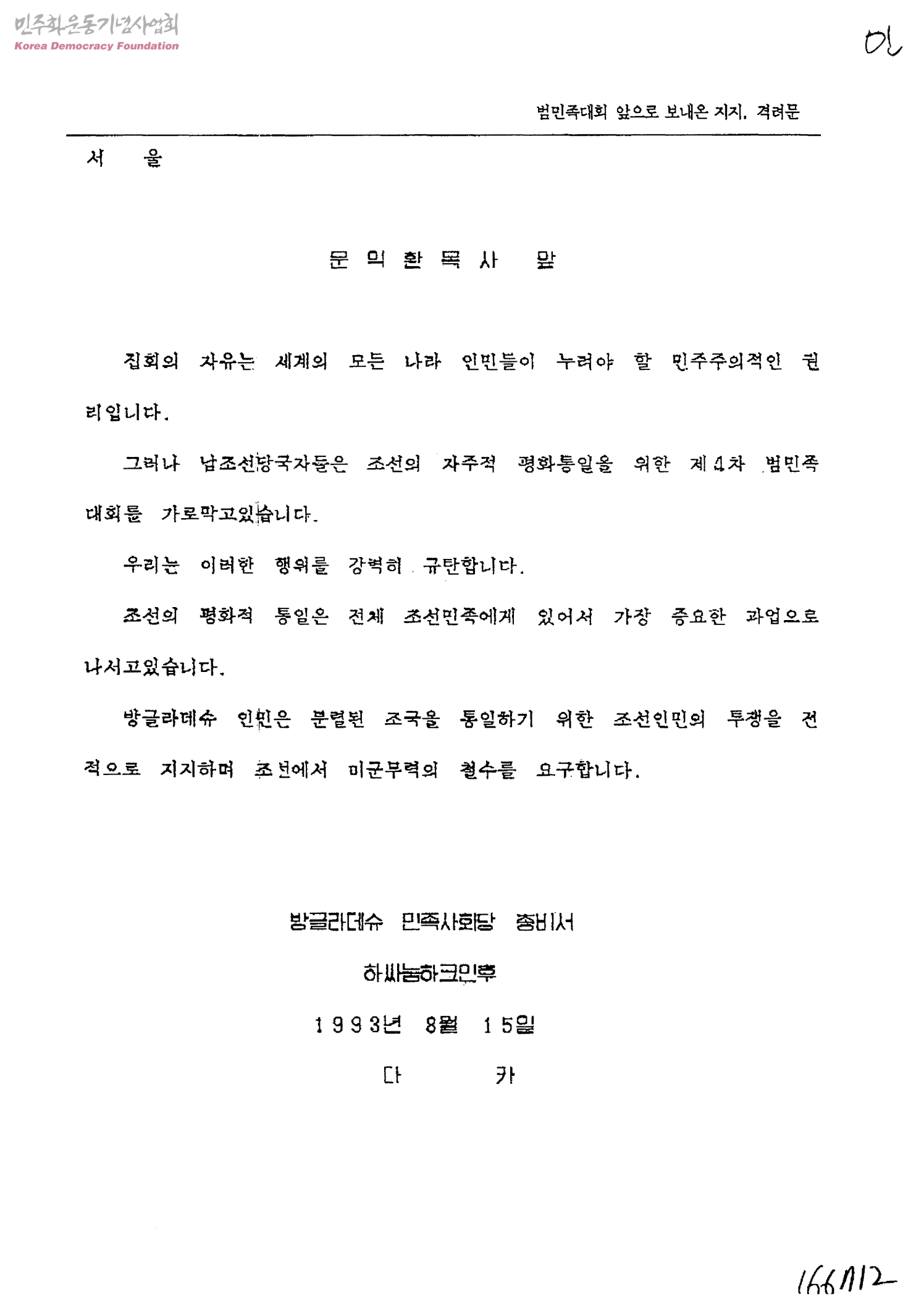 범민족대회 앞으로 보내온 지지, 격려문[수신:문익환목사, 발신:방글라데슈 민족사회당 총비서 하싸눔하크인후]