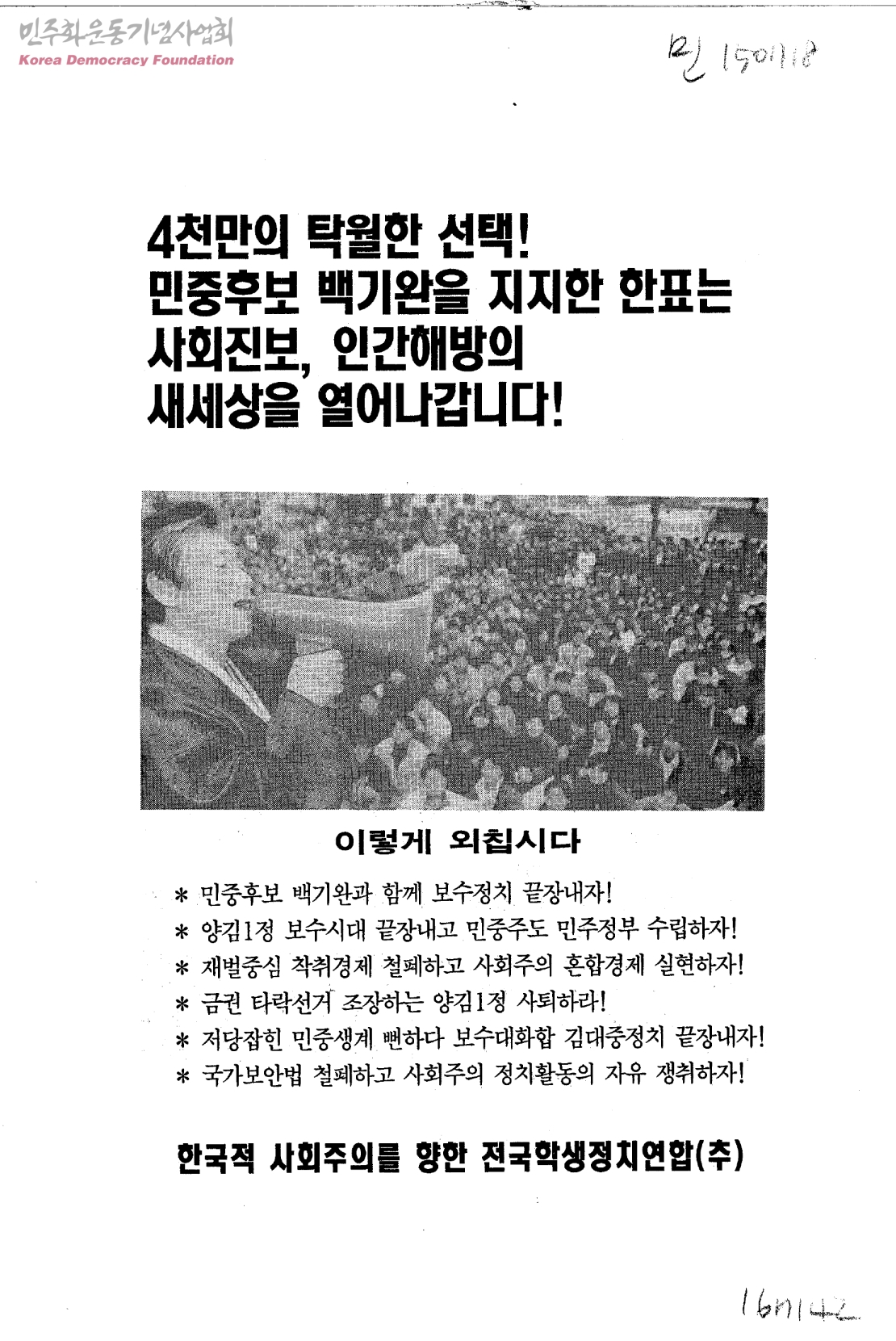 4천만의 탁월한 선택! 민중후보 백기완을 지지한 한표는 사회진보, 인간해방의 새 세상을 열어나갑니다