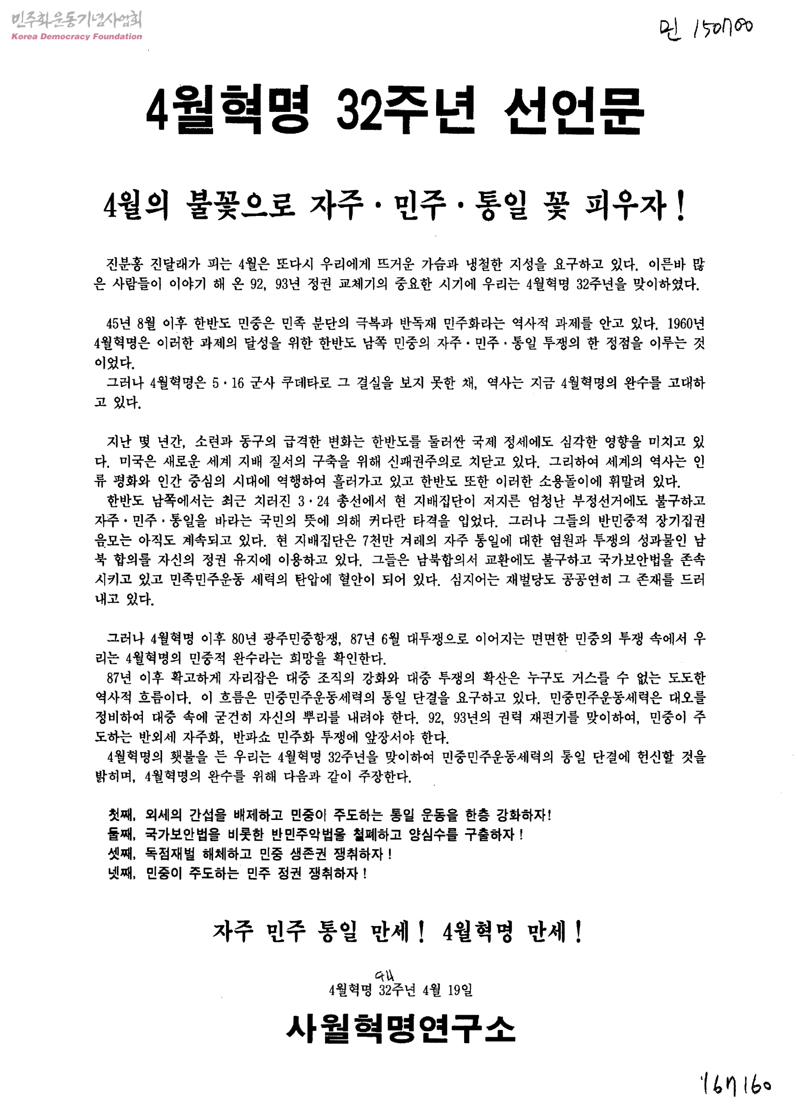 4월혁명 32주년 선언문-4월의 불꽃으로 자주ㆍ민주ㆍ통일 꽃 피우자!