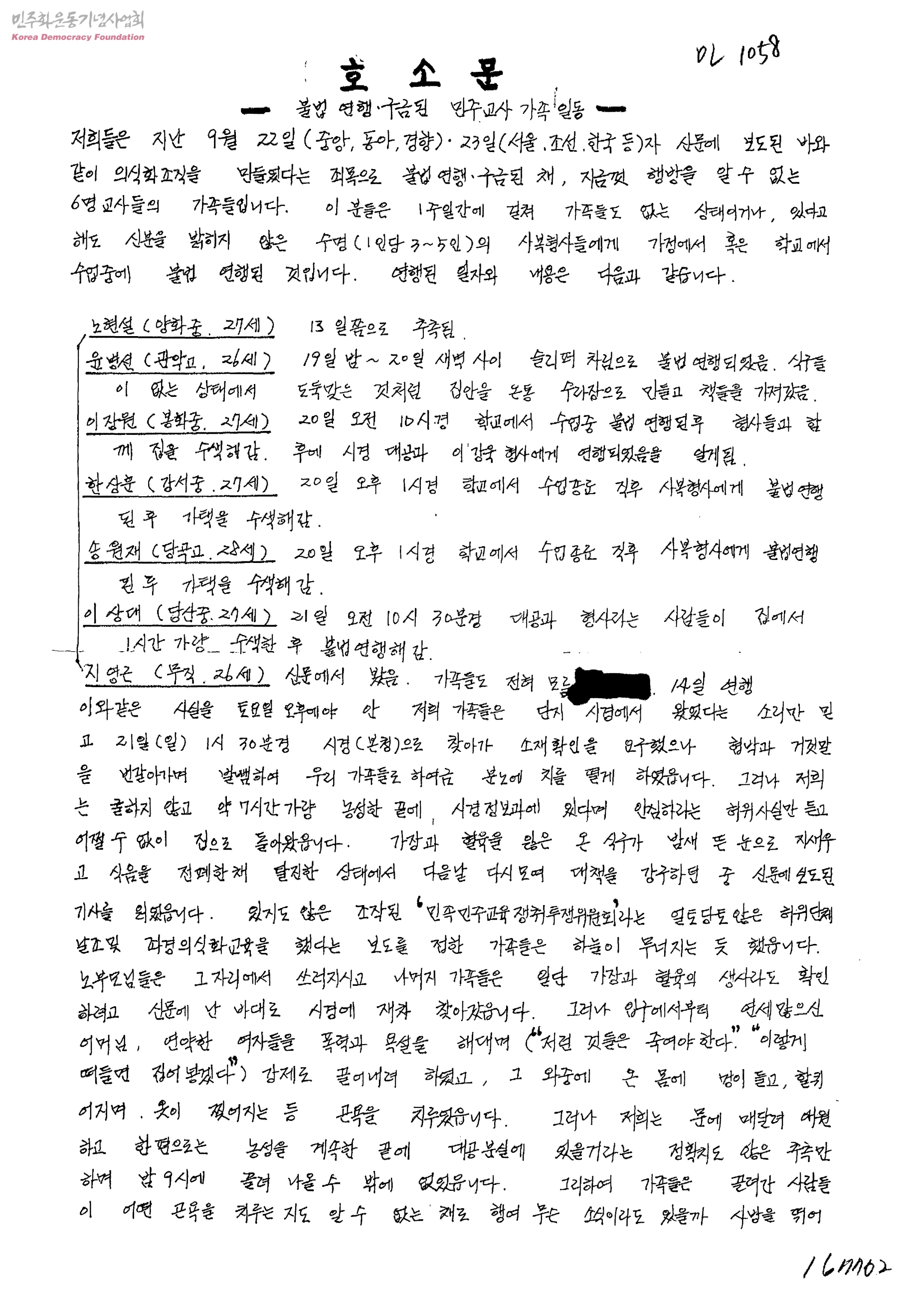 호소문-불법 연행ㆍ구금된 민주교사 가족 일동